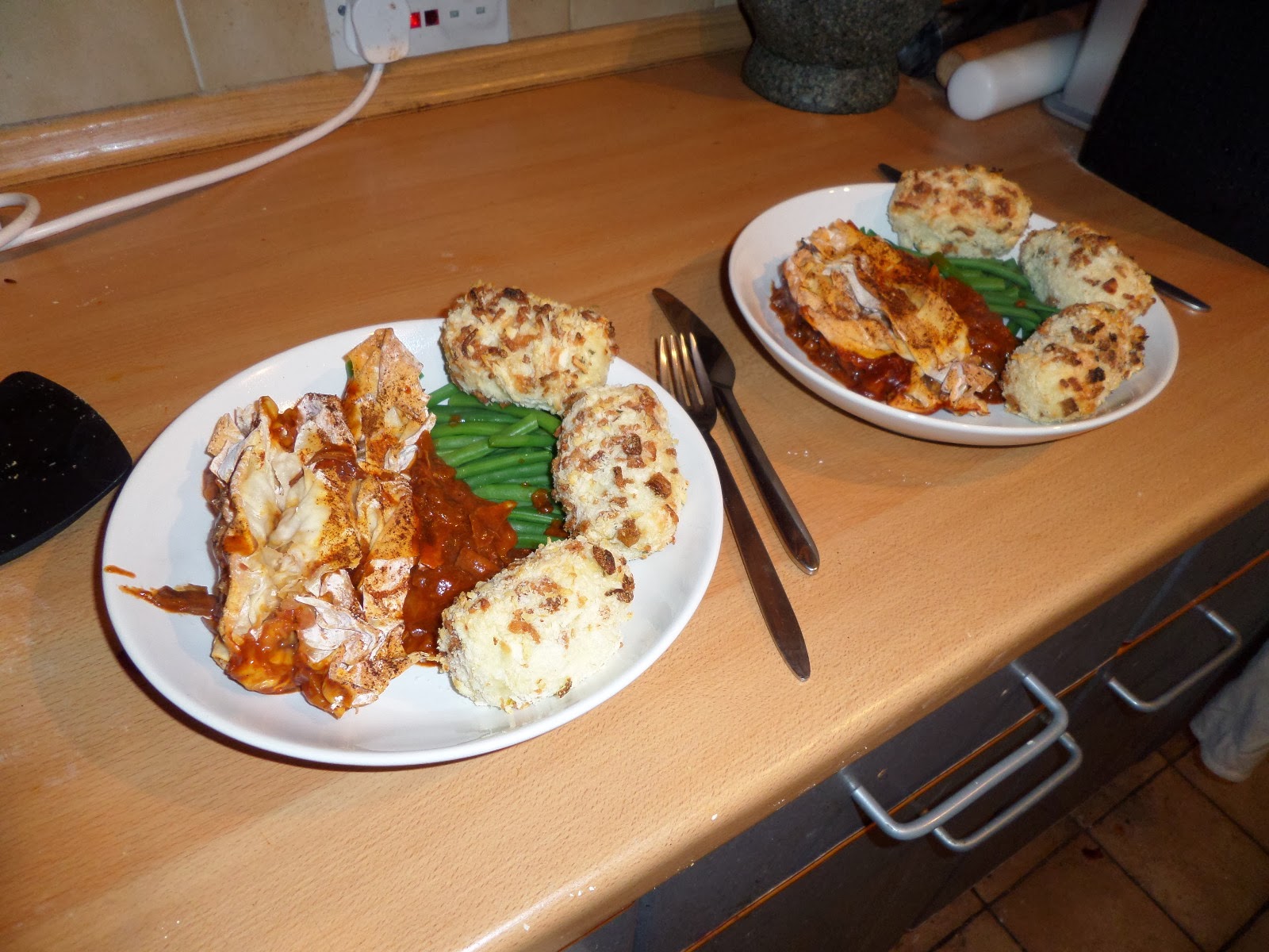We served with green beans and some spicy croquets. The croquets have chopped pickled jalapeños in, and are covered with panko and crispy onion bits.