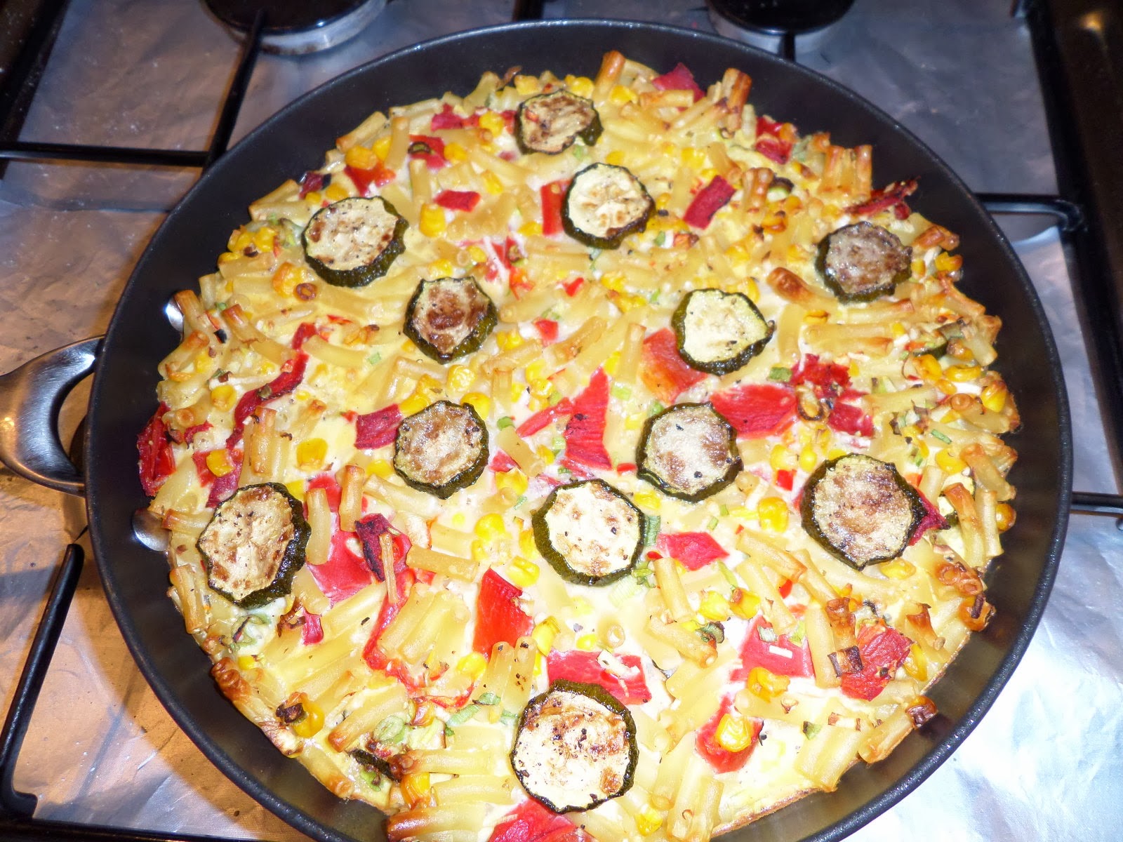 Liberally spray an ovenproof frying pan with oil and spoon half of the macaroni mixture into the pan. Level it off and place a layer of the courgette slices over the surface. Cover with the remaining mixture, then add the remaining courgettes.
