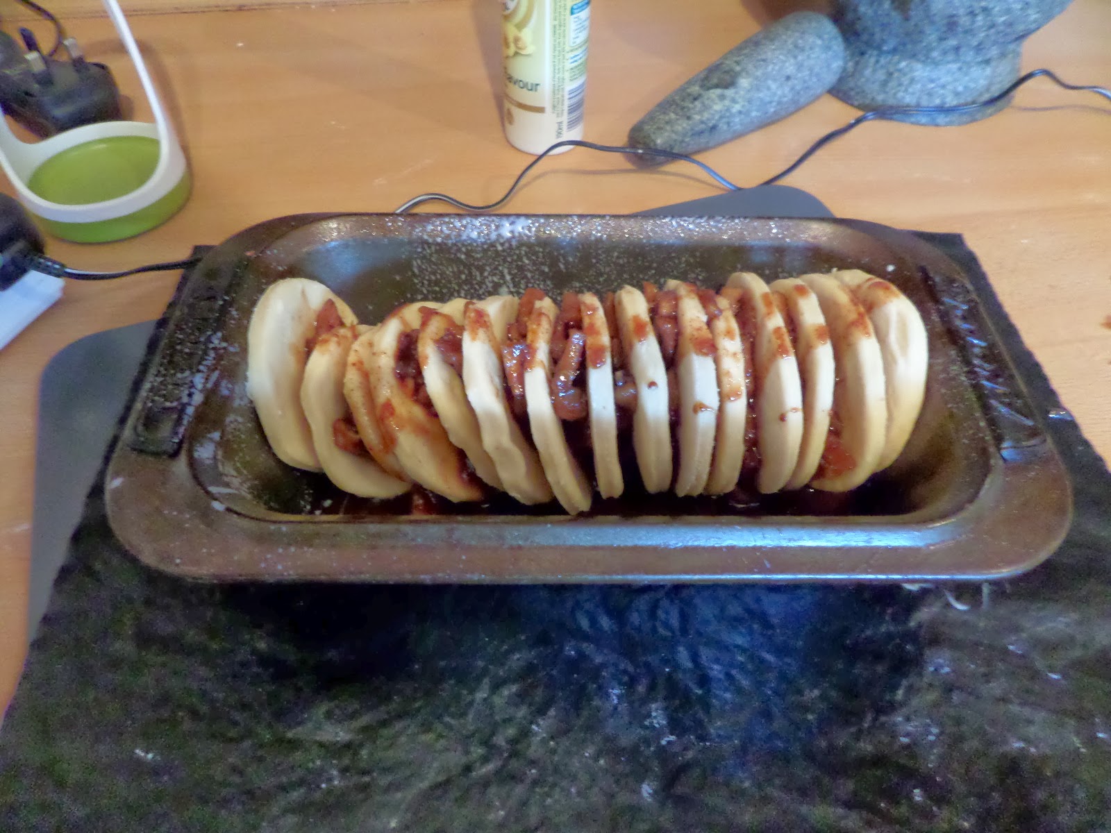 We ran out of apples after 15 biscuits. It could have done with a few more to fill the tin properly, but it does give us 4 biscuits left over to use for a cherry cobbler later. Despite running out of apples there was still sauce, so we just poured that over the top.
