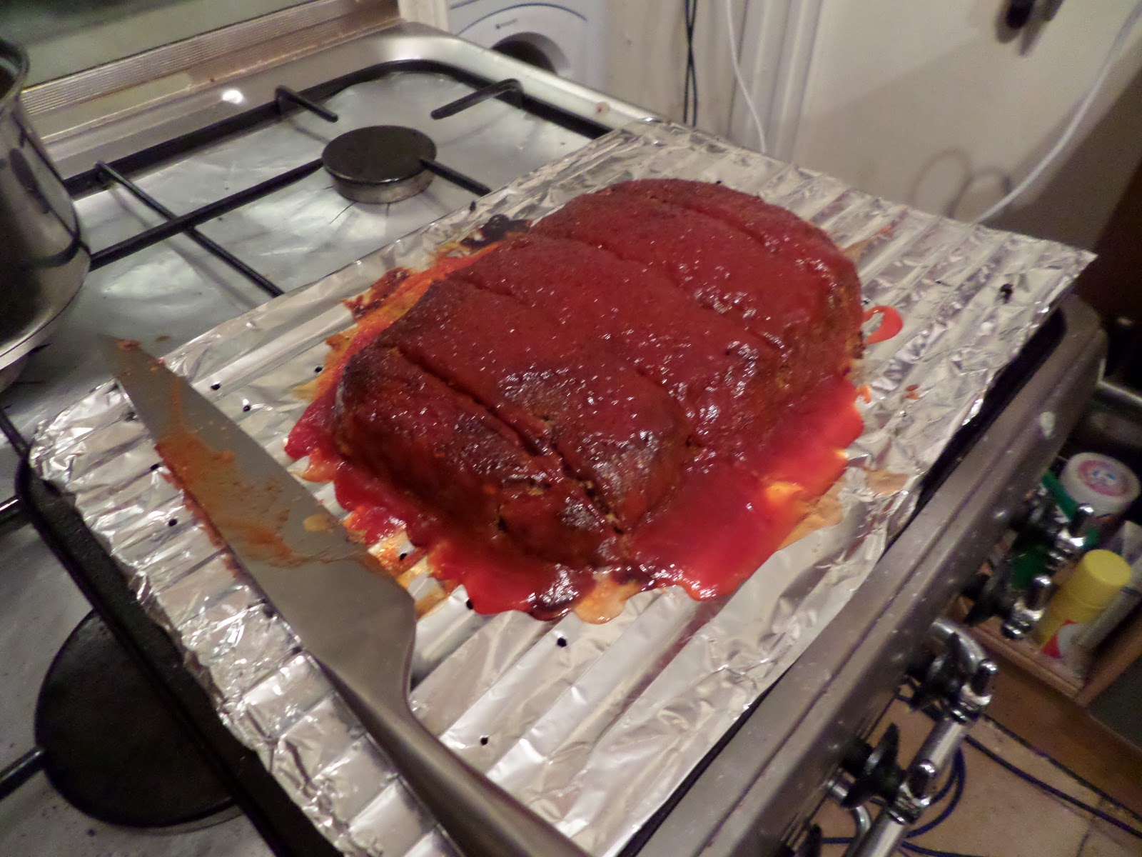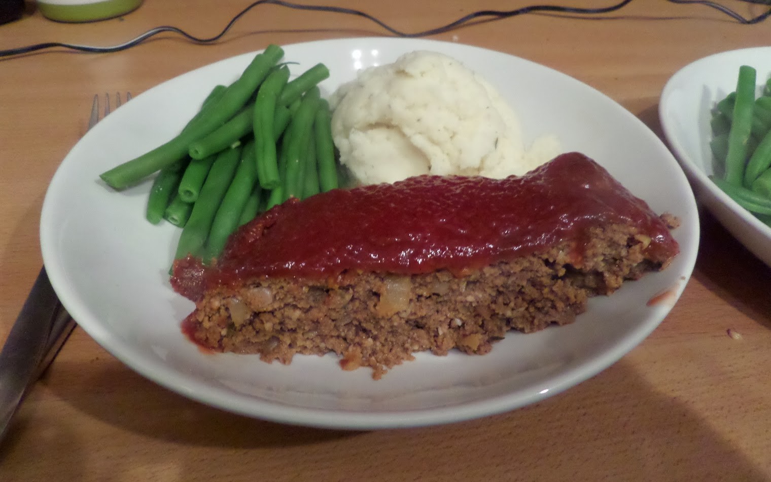 And it was delicious! It was a bit fally-aparty, which we assume real meatloaf isn’t. From what we’ve seen on TV meatloaf should stay together in thin slices, and this certainly wouldn’t: it fell apart in the thick slices we had.