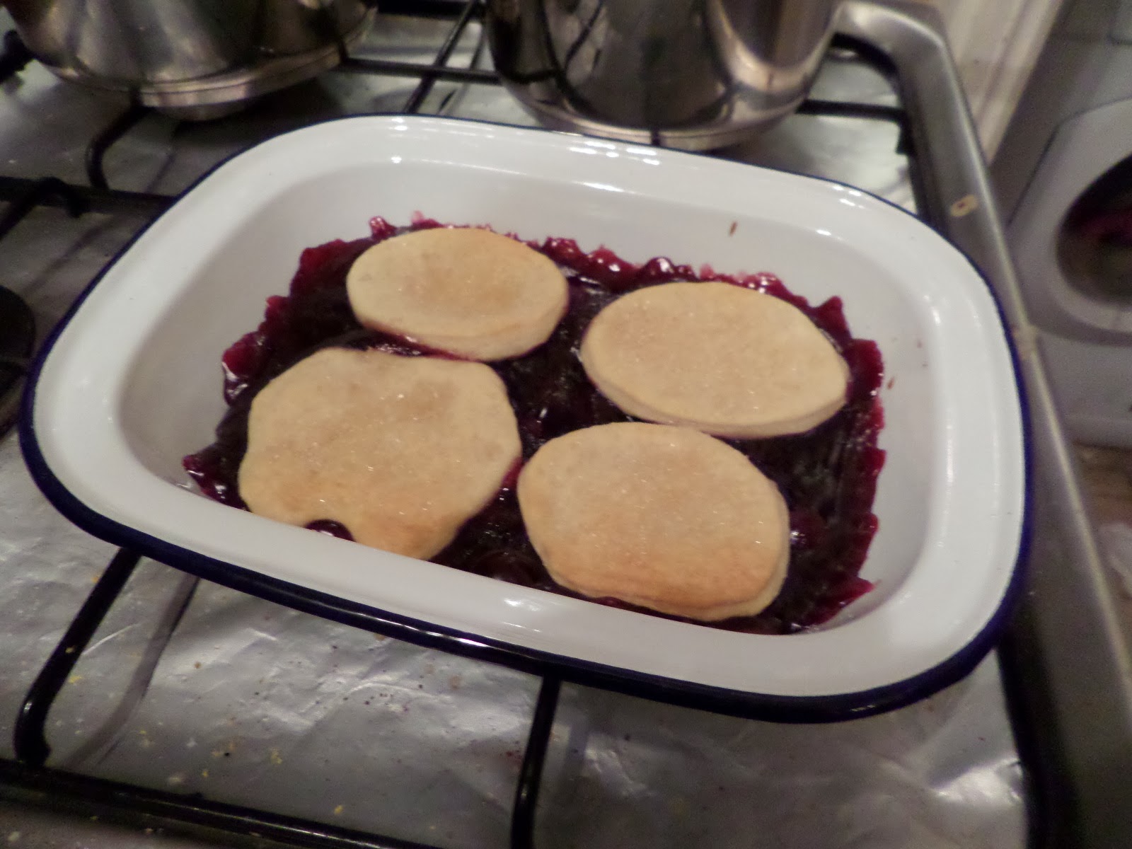 Method: open can of cherry filling and put in pie dish, throw leftover biscuits on top, sprinkle demerara sugar on top, bake for 25mins at 180C fan.