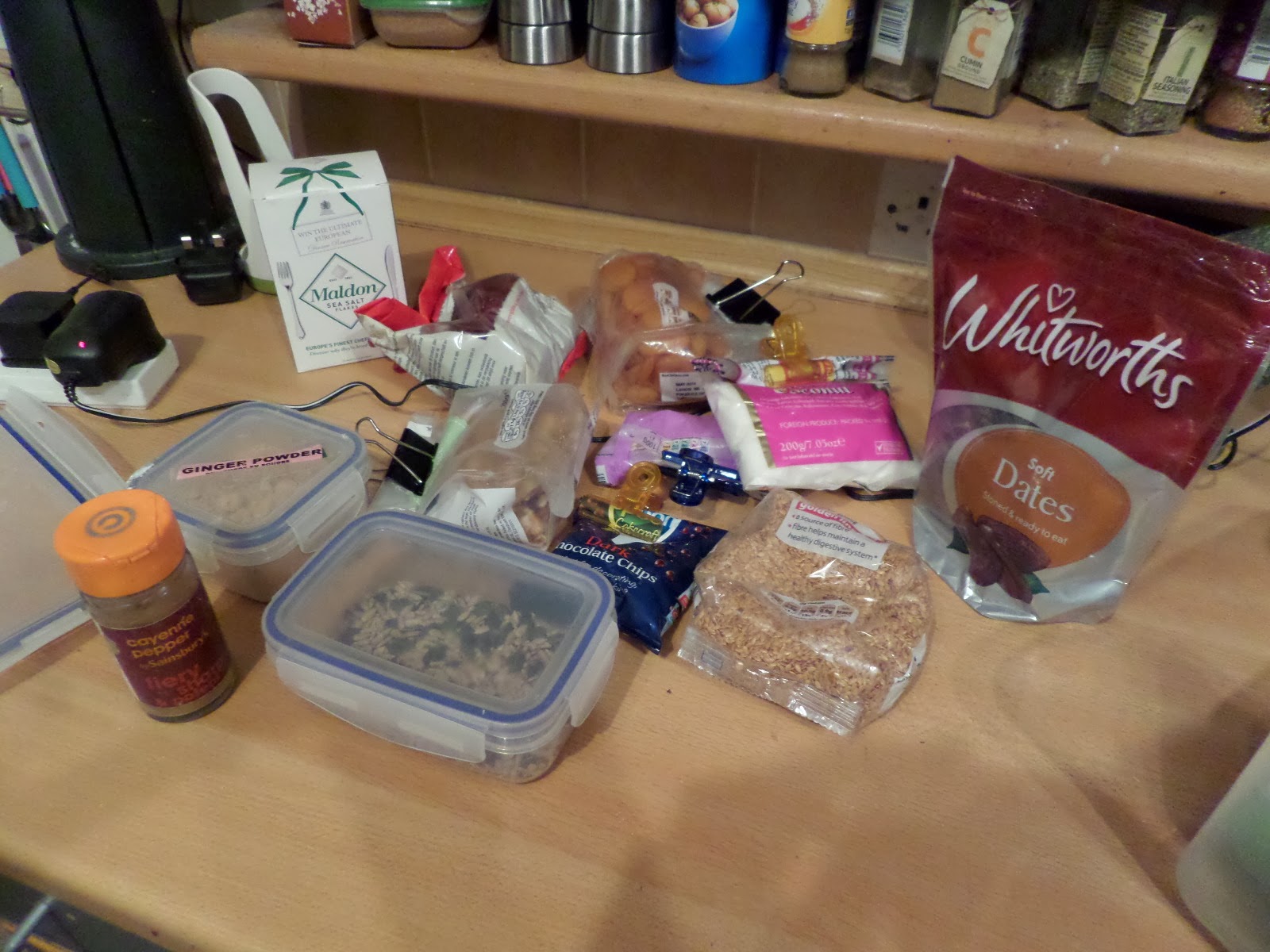 So I tipped out all the open packs of fruit and nuts on the counter, along with a pack of dates that would make a good sticky base for the bars, and some ginger and cayenne for a bit of a kick!