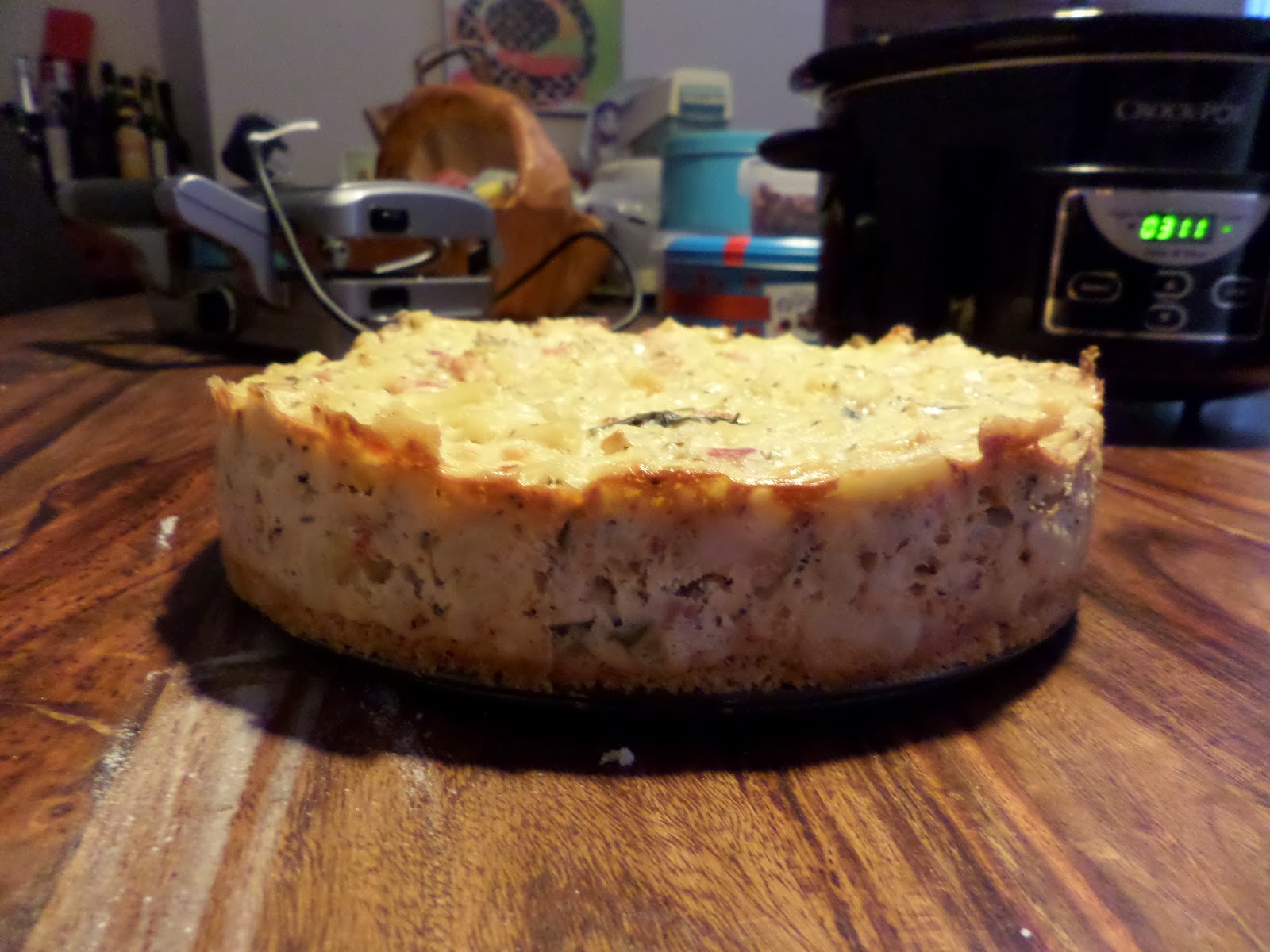 The main cheesecake part is a drier-than-normal mac’n’cheese with eggs to help it set like a cheesecake. I won’t go into details here as the original post covers all the details you need with clear pictures for all steps. The only changes I made were to add some garlic and chilli to the mix, because we do that to everything in this house, and replaced the tomato in the recipe with bacon because as the sign above our kitchen door says: