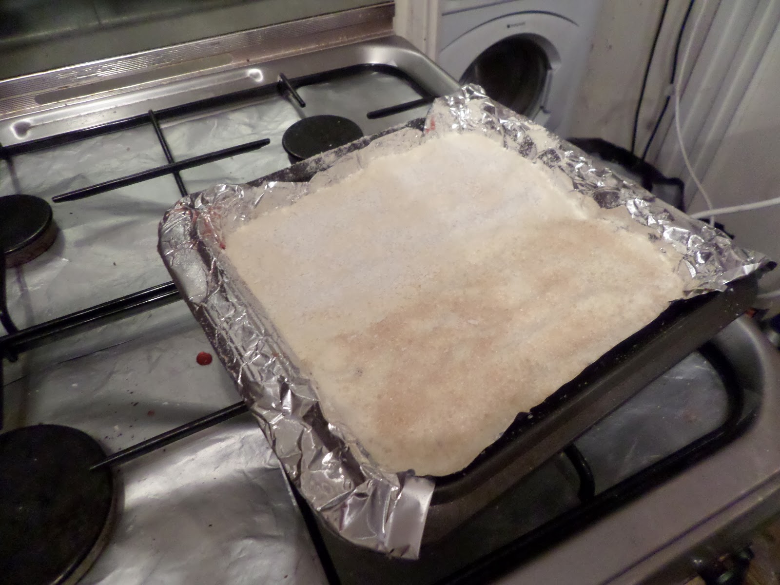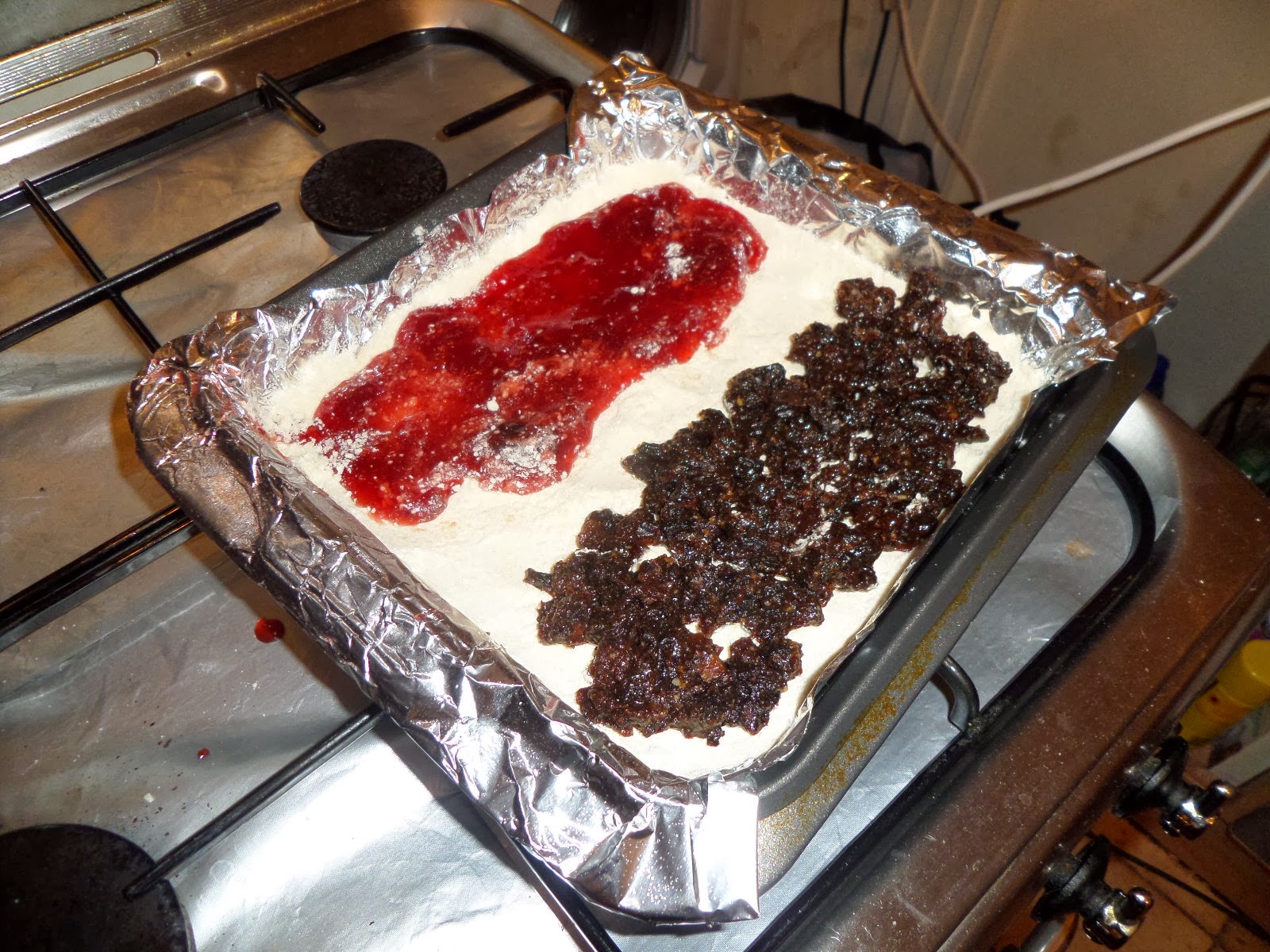 So I’m making my old school’s shortcake with a layer of mincemeat in the middle. Except there wasn’t enough for the whole tray, so I found some strawberry jam in the fridge and used that for the other half.