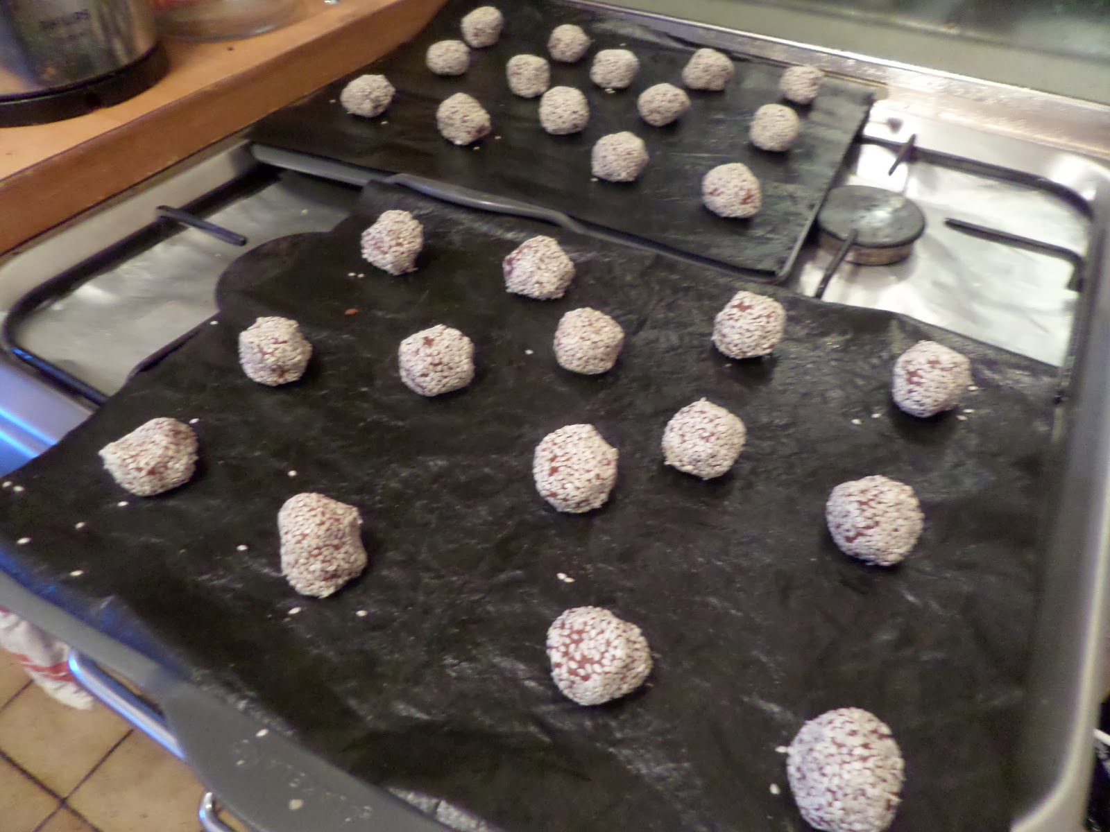 Reduce speed to low and add flour. Mix until just combined. Scoop 1 tbsp portions and roll ~24 balls (28 in my case… and a little bit might have got eaten :). Roll balls in sesame seeds to coat. Place rolled balls on lined baking sheets. Chill while you turn the oven to 160C fan.