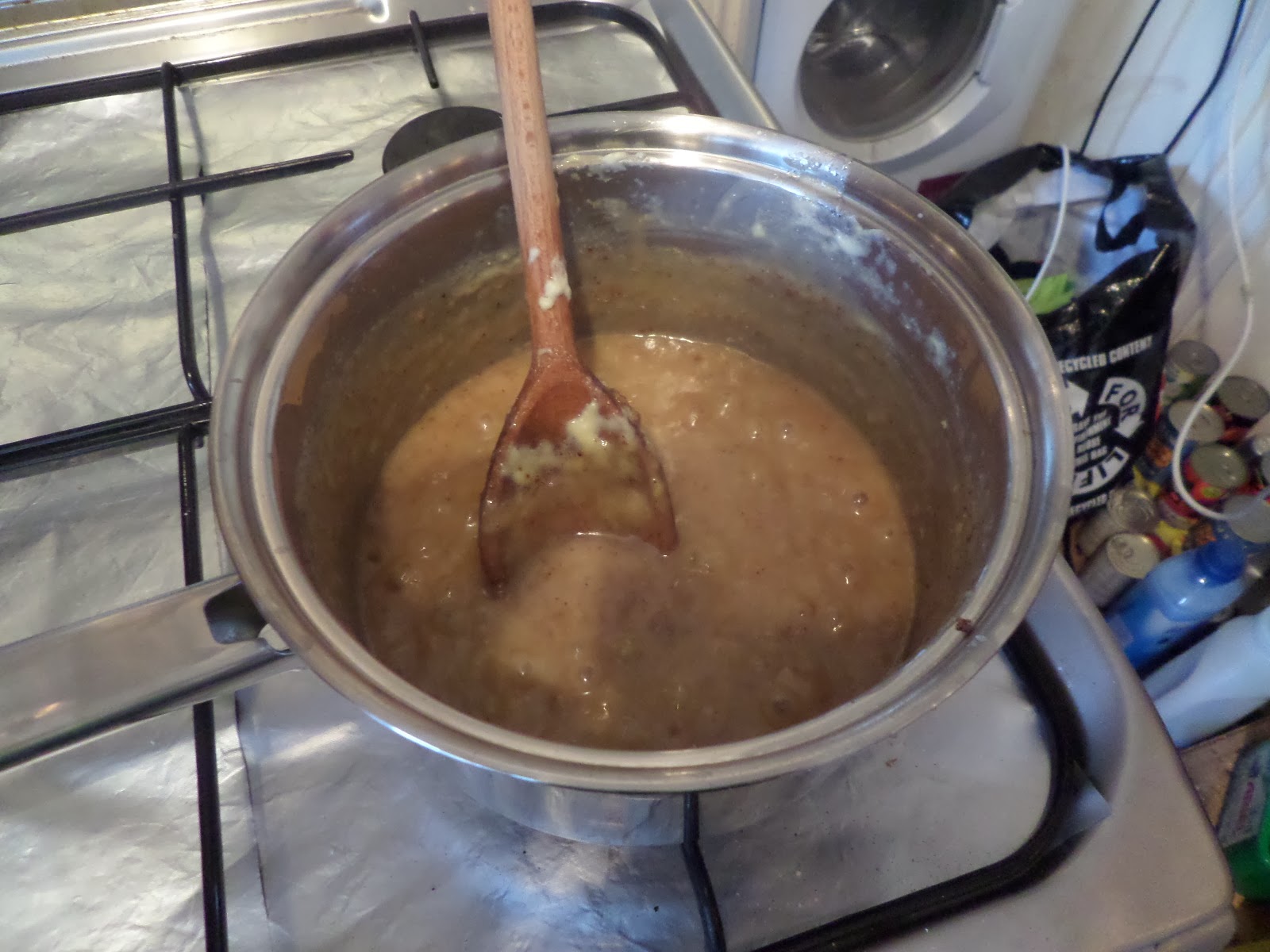 Bring milk & cream to the boil and simmer for 40 minutes (!) until thick. Actually this got over an hour because a) it didn’t thicken much, and b) I was baking cookies at the same time!