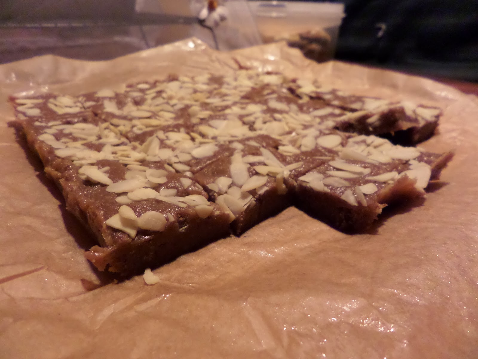 Transfer to a sling-lined baking tin and sprinkle flaked almonds on, pressing them in.