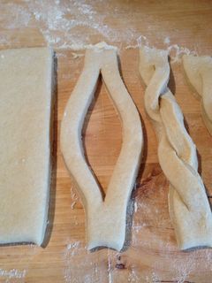 Finally roll out into a rectangle and cut into 8 rectangle strips. Cut a line in the middle of each strip, and twist together, as shown in this pic lifted from James’ site: