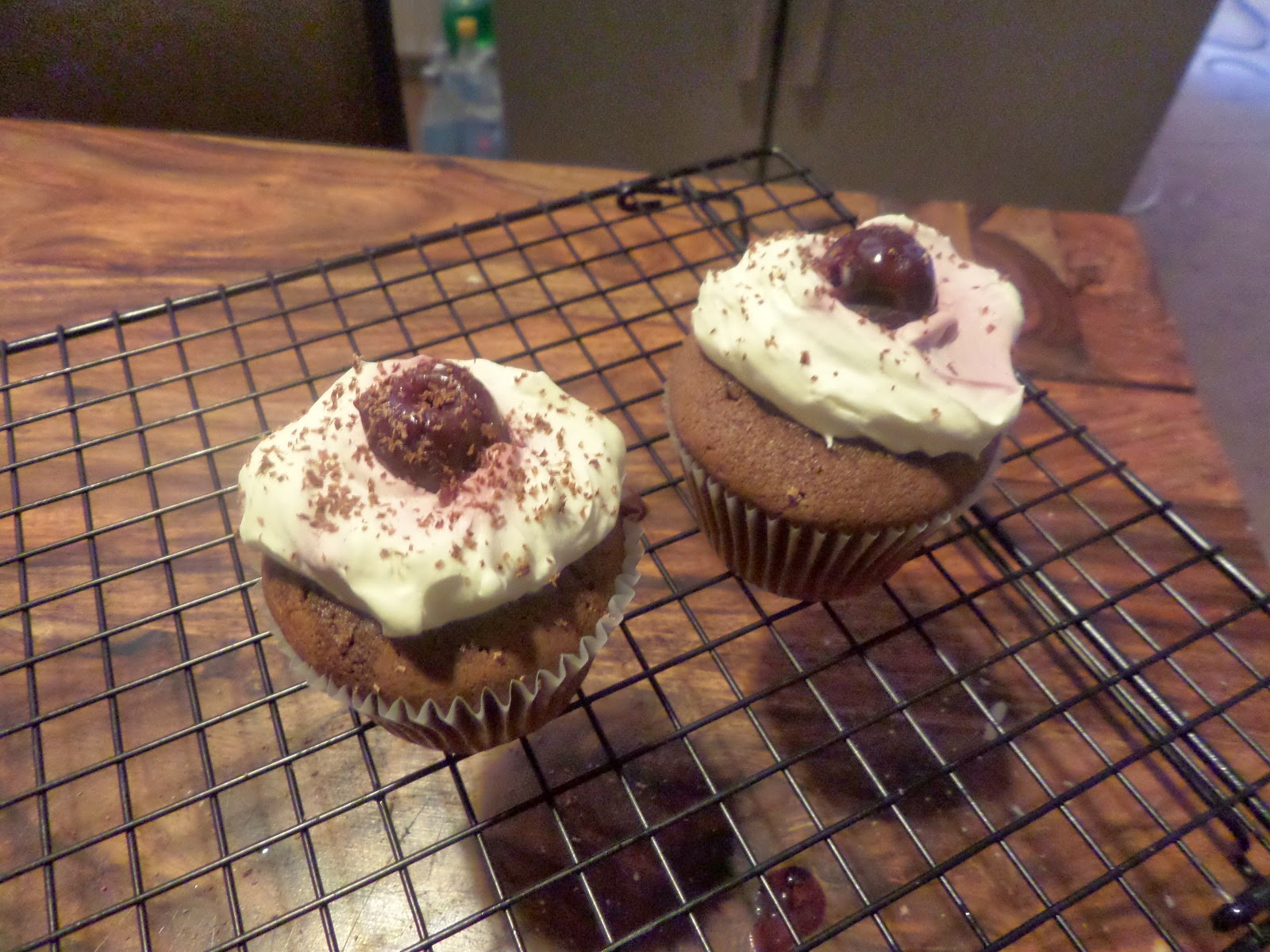Soph’s been planning to make Black Forest Cupcakes for a while now, and after running a 10k race on Sunday she decided she needed cake to replenish her strength! She used a BBC Food recipe, and improved it by putting a whole cherry inside as well as on top!