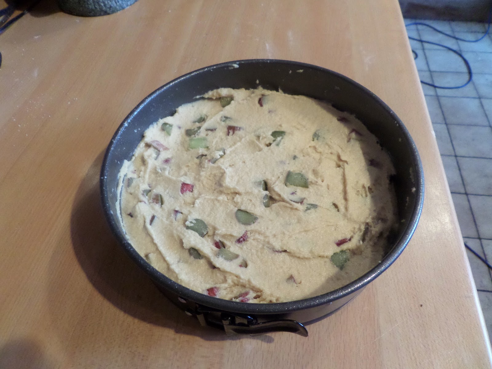 Mix the ground almonds, semolina & baking powder. Cream the butter & sugar, beat in the eggs and lemon zest, then mix in the dry ingredients. Finally fold in the rhubarb by hand. Transfer to the cake tin.