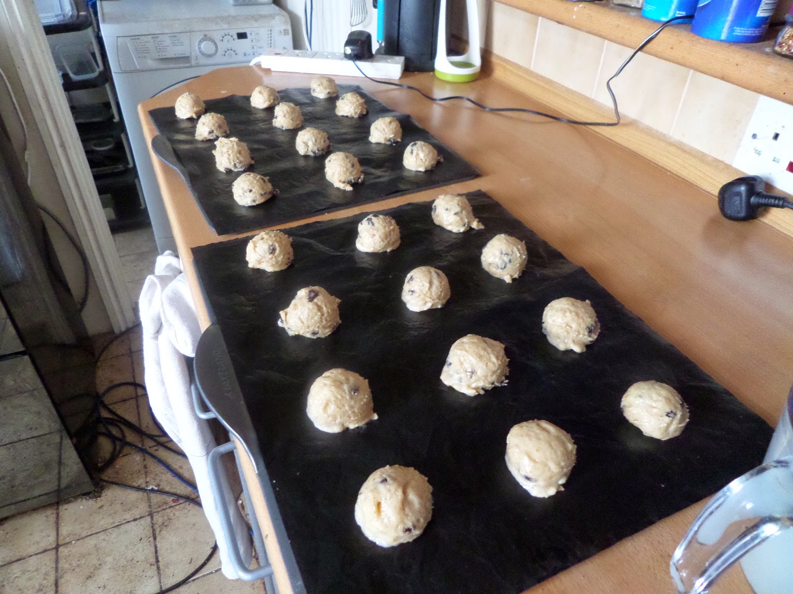 There was enough left for another tray, and these I decided to cook entirely differently: more like rolls than cookies. Heat oven to max, no chilling, down to 200C fan once they’re in, cook for 10, turn, flap the door a lot to reduce heat and down to 140C fan for another 10 minutes, check, then 10 minutes more. They don’t look that different…
