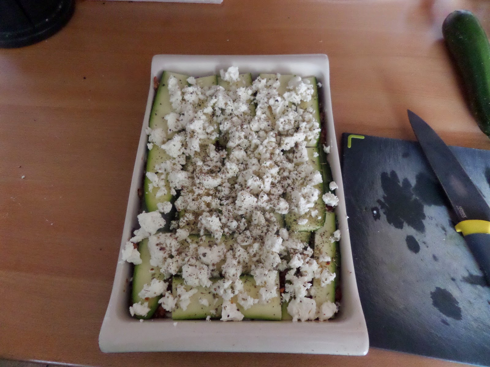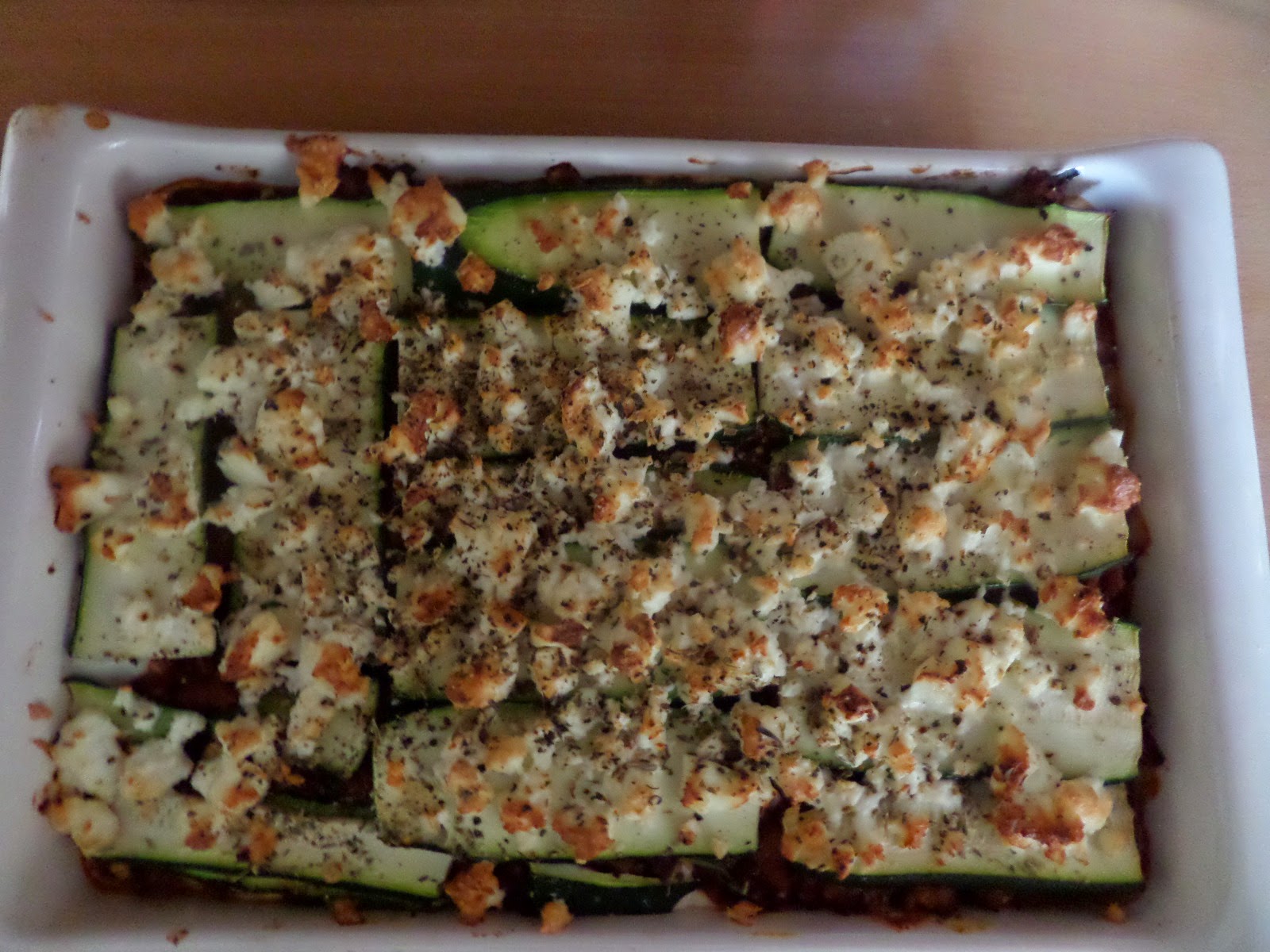 So basically make a normal tomato, onion & mince sauce, and layer with courgette strips, and tops with crumbled feta.