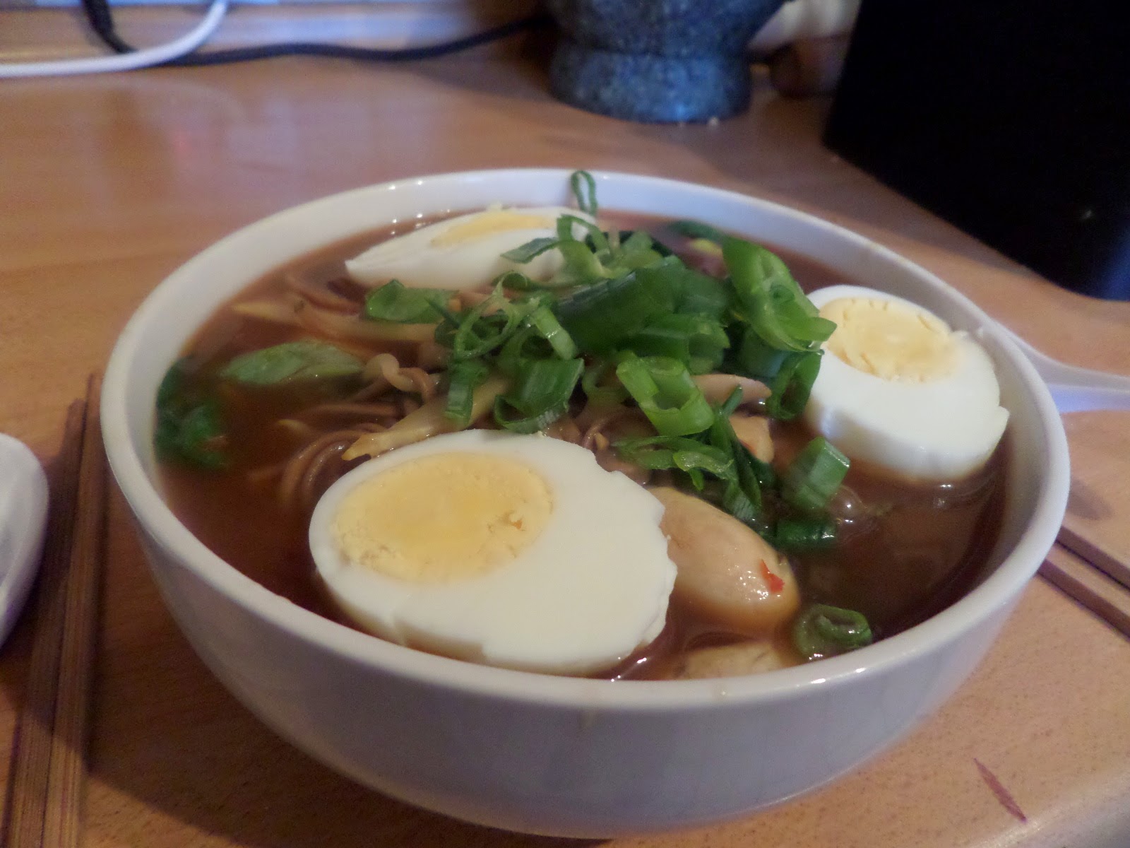 Originally I wanted to make something authentic, but every book, magazine or website I read has completely different ideas about what authentic ramen is. There doesn’t even seem to be any agreement about what sort of noodles to use. So I’m just going to put soba noodles that we’ve got in the cupboard in soup and be done with it!