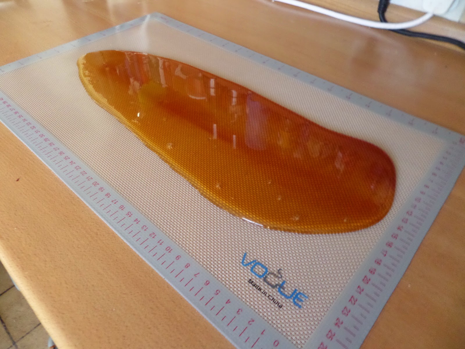 As  soon as it hit 150C I turned off the heat, carefully removed the probe with oven gloves, more oven gloves for picking up the pan, and poured out onto a silicone mat to cool. It looks a bit thick for a shard, but there’s not much I can do about that now… so I just have to wait for it to cool.