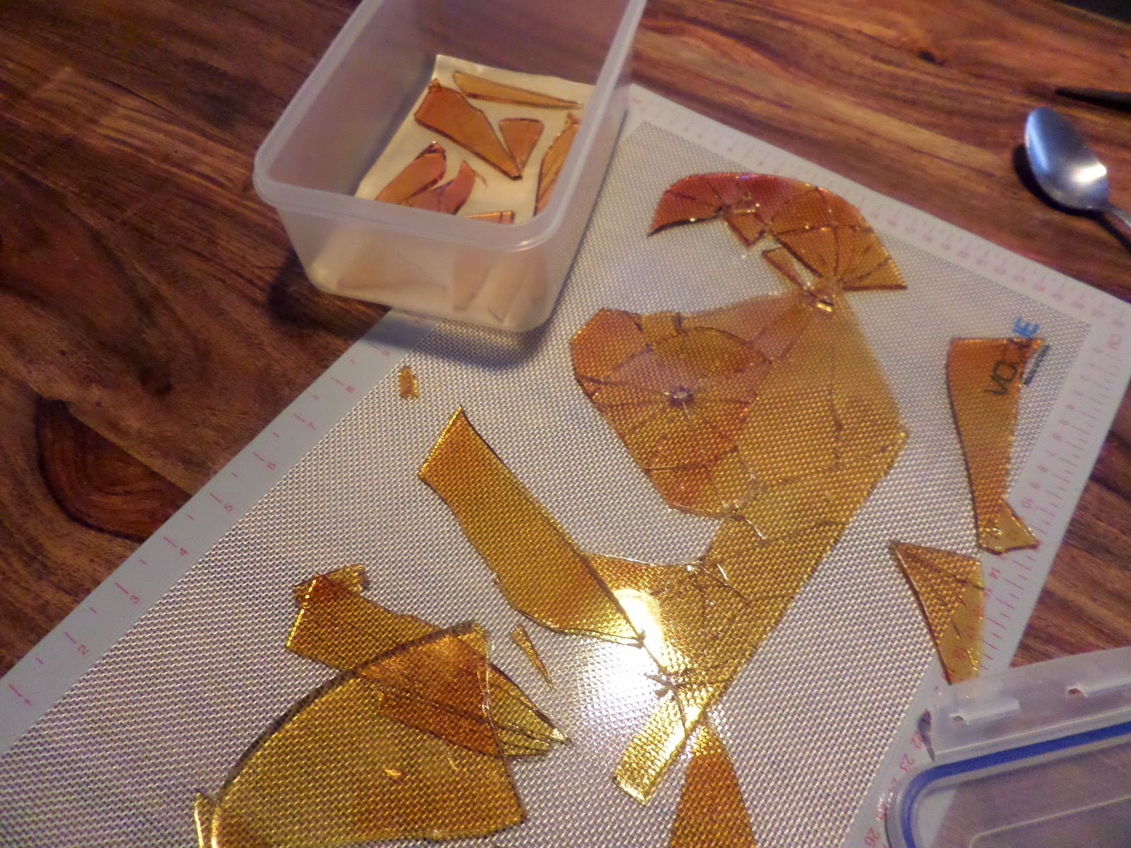 Cracking it with a spoon is fun! It is a little thick: I think I’ll have to be more bold about pouring boiling sugar onto the mat next time! However it does have a really deep caramel flavour.