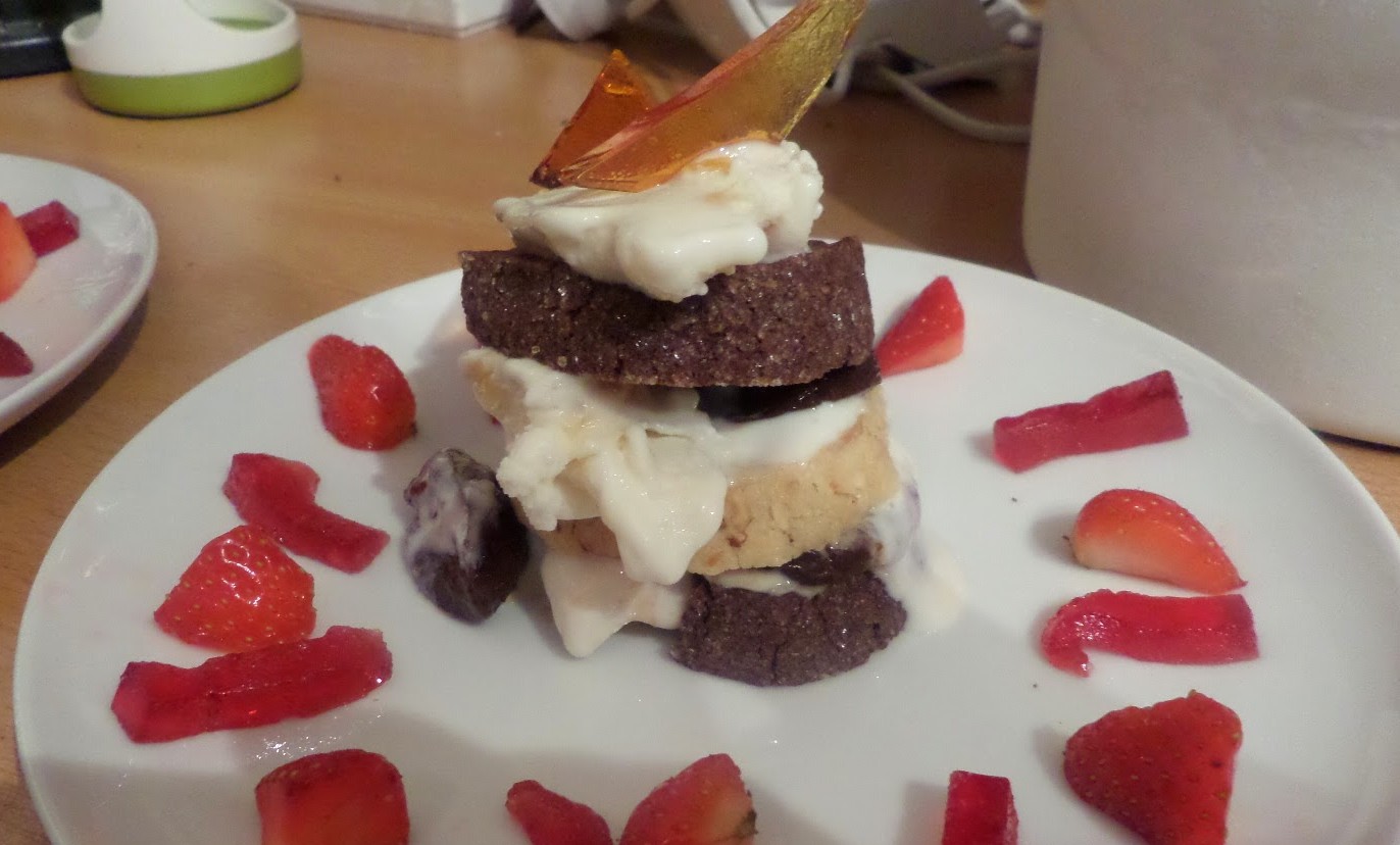 All very nice! OK they stacks fell over shortly after the pictures were taken, but there was a lovely mix of textures backing a summer fruits taste theme.