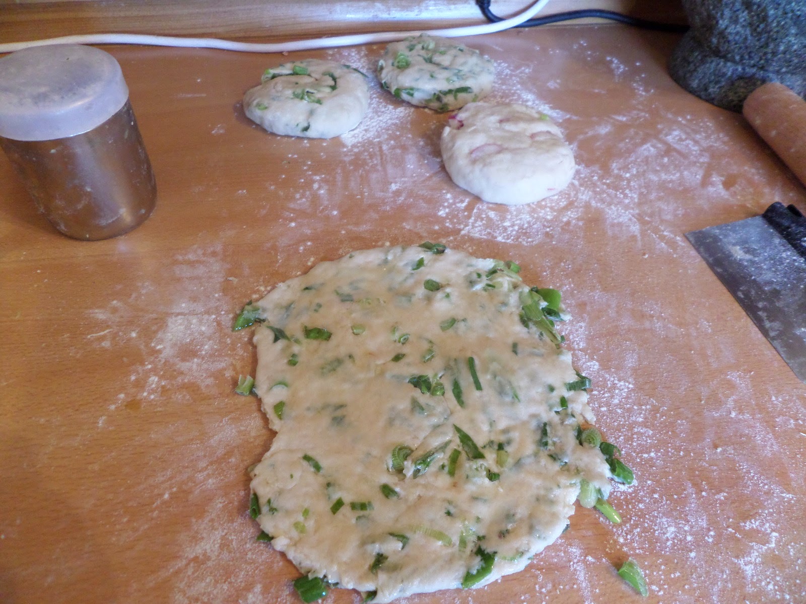 Divide into four balls. Roll out each ball to 20cm. Brush with oil and top with spring onions.