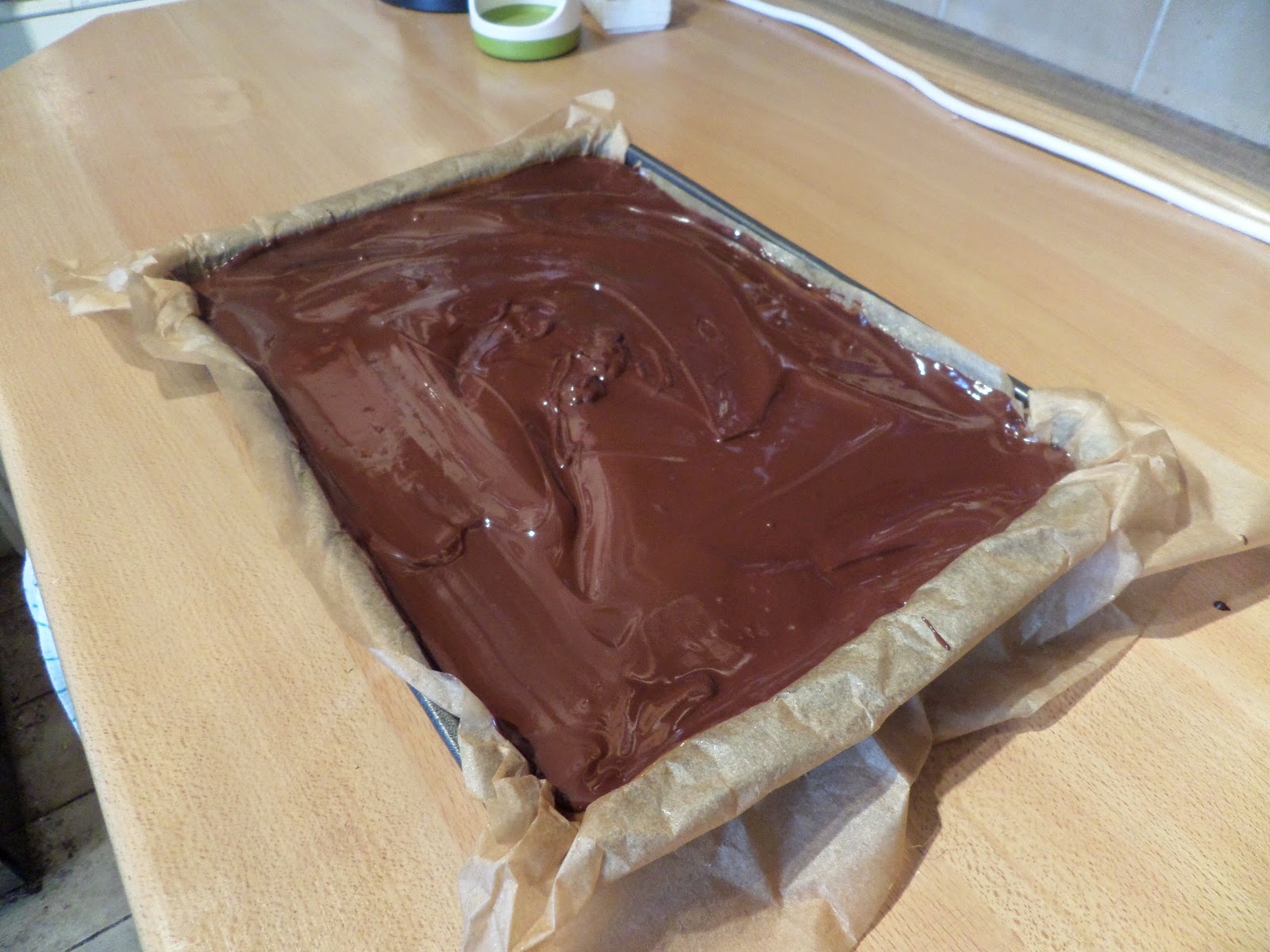 Pour over the set peanut butter layer, and chill for two hours to set.