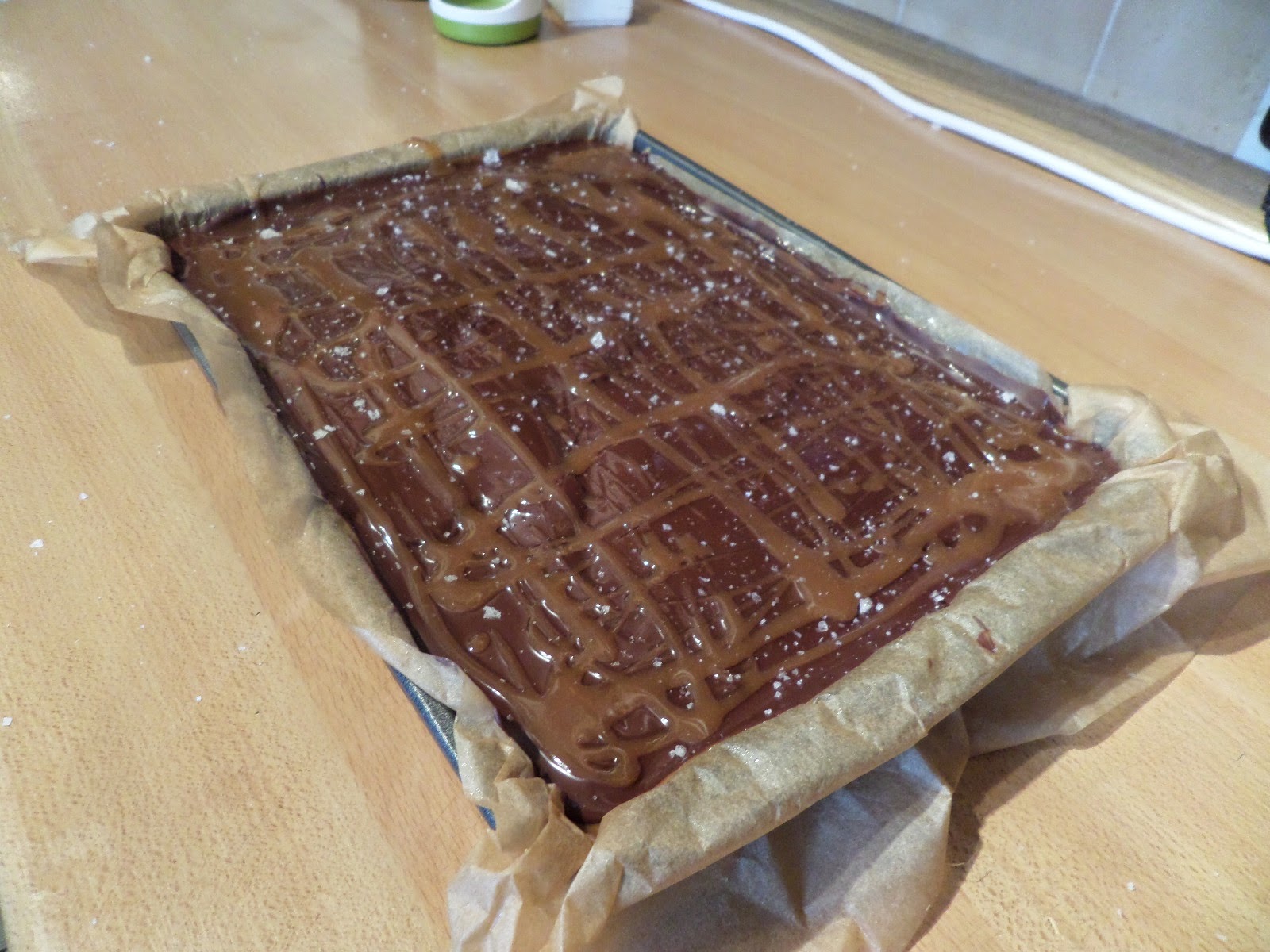 Melt the chocolate over a bain-marie. Pour the chocolate over the set caramel layer.