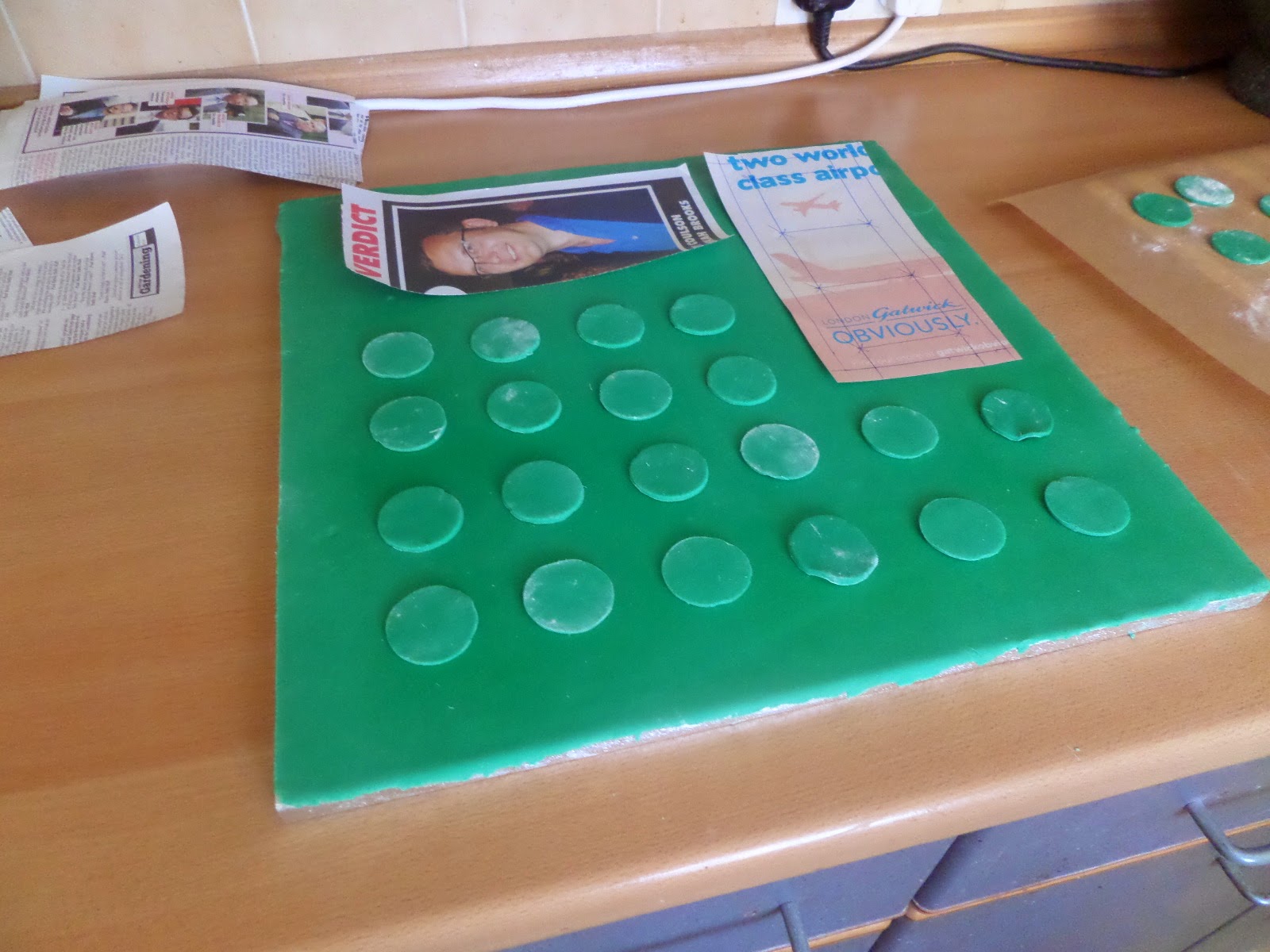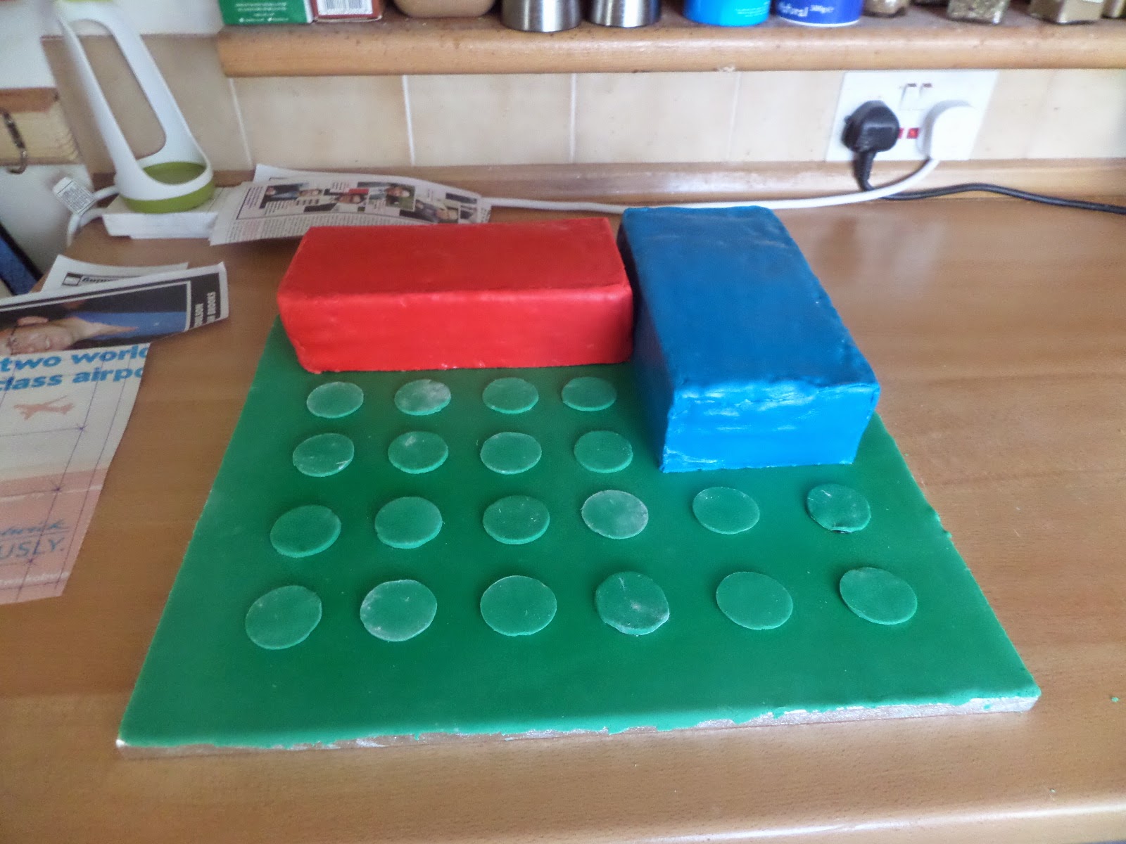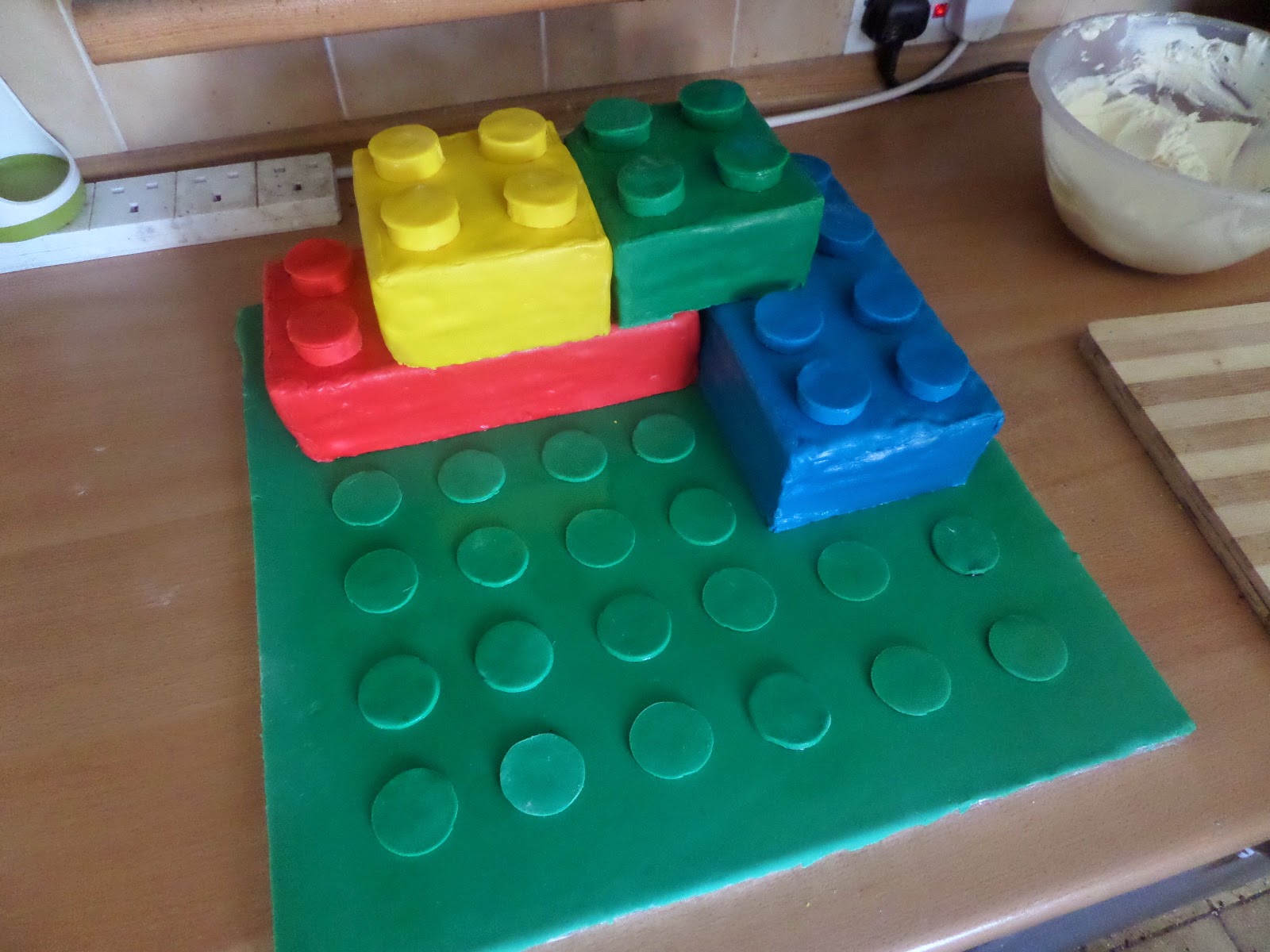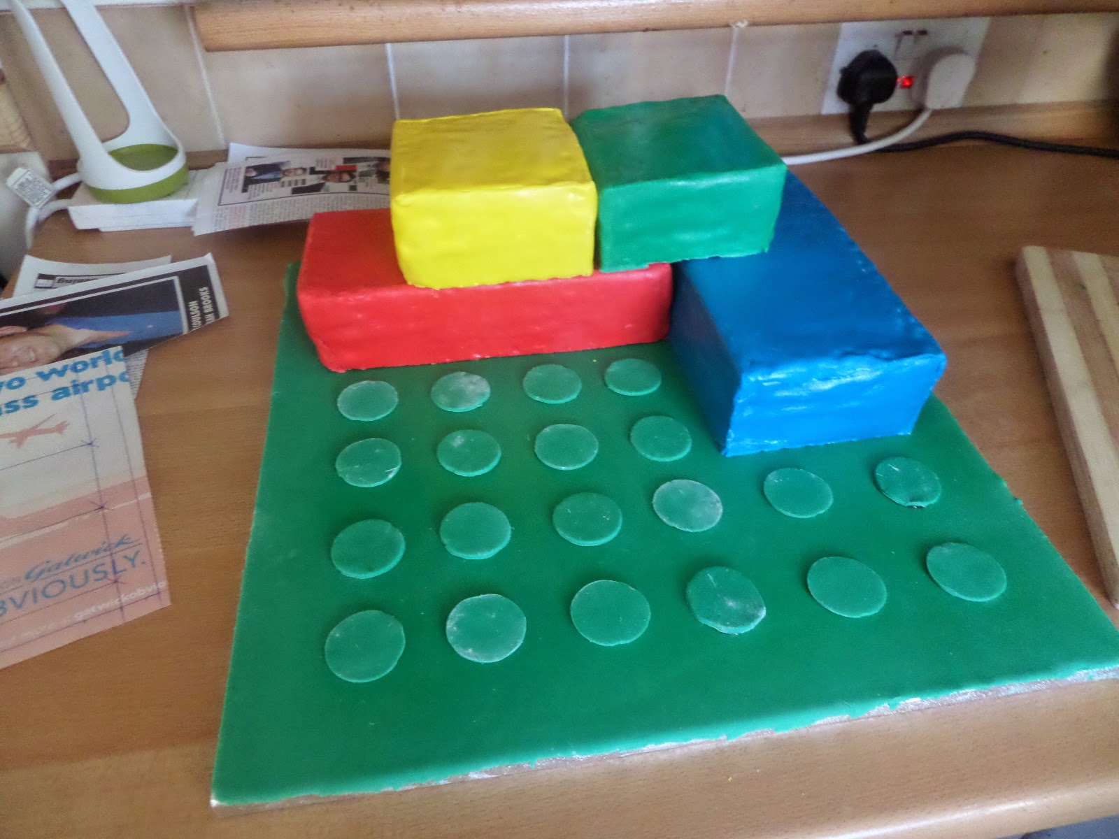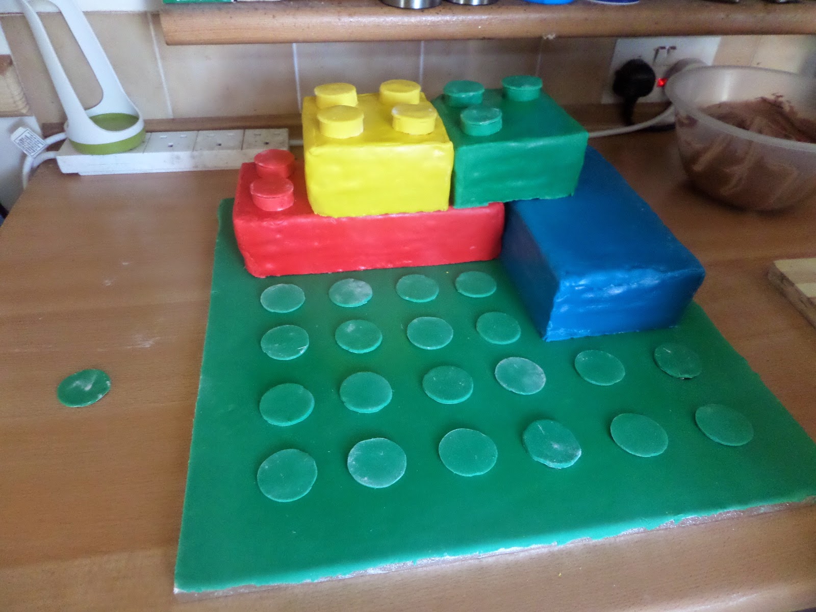 We lined a large cake board with green fondant icing and put discs of the same icing on to make it look like a green Lego board.