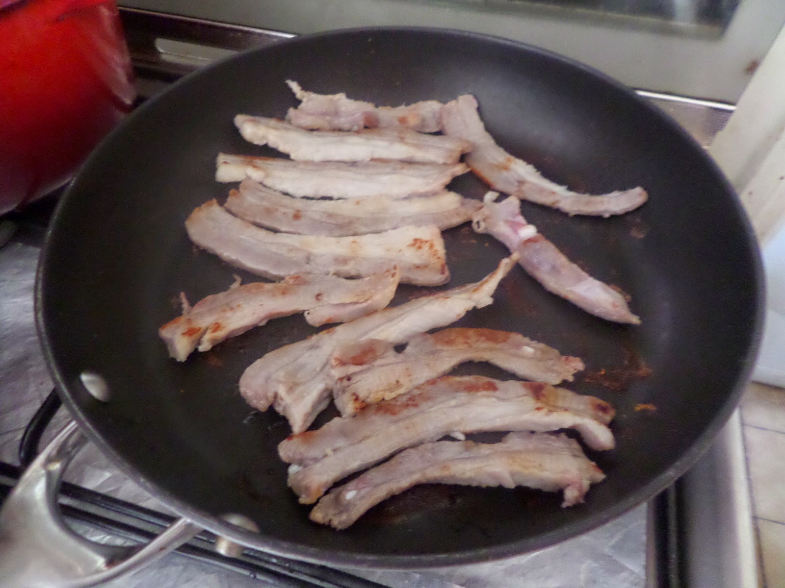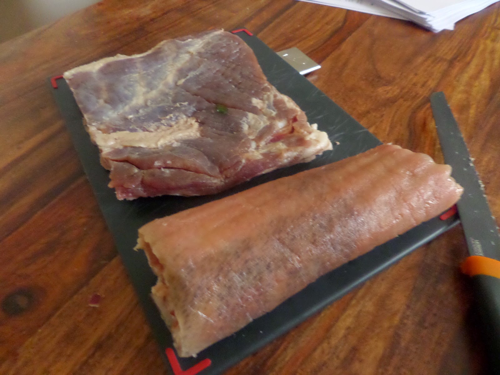 But first we ned to remove the rather hairy skin. This wasn’t mentioned, and is rather fiddly! You feel like you’re removing half the meat, although then you check it’s nearly all skin and grisly. Thankfully we were planning to keep a chunk back to freeze, which will use in the future to make Boston beans, so we wrapped an edge in the skin for this purpose.