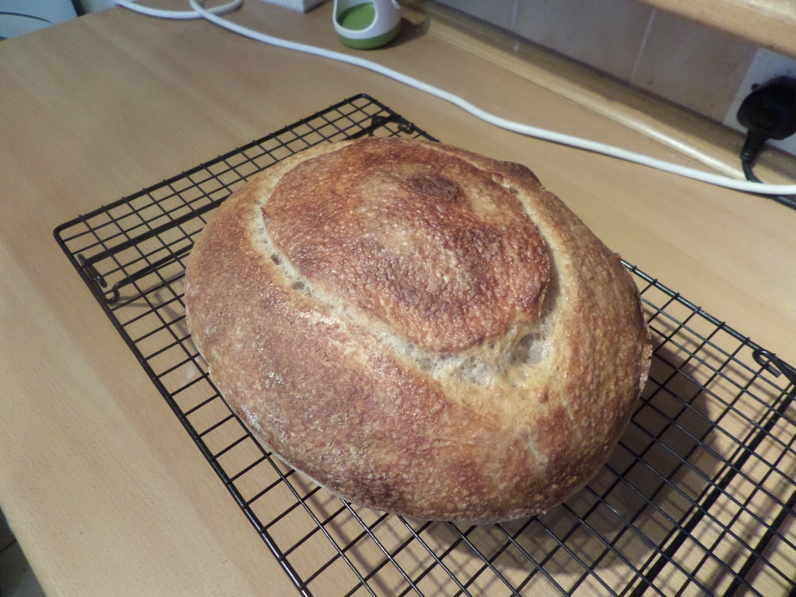 - Friday evening after work ~7pm: cut a halo in the loaf using a serrated knife, spray with water, and pop in the casserole with the lid on for 25mins at full temp, then remove the lid and reduce to 180C fan for 15mins.