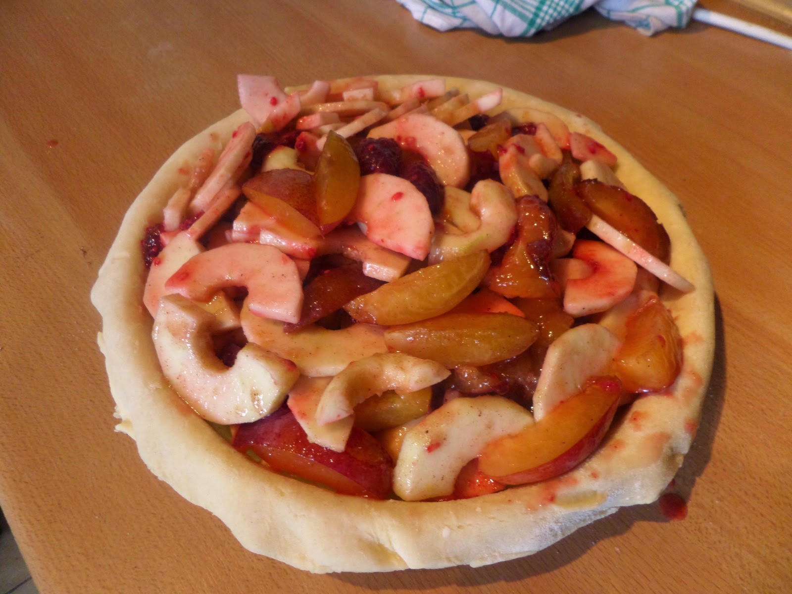 Eventually it’s time to mix up the filling of fruit, sugar, spices and flour and put it into the pie, making a mound in the middle.