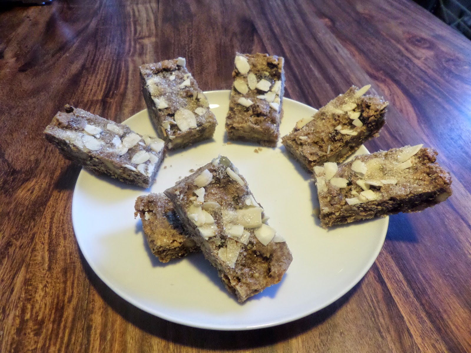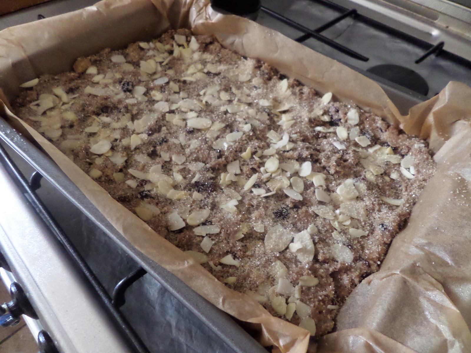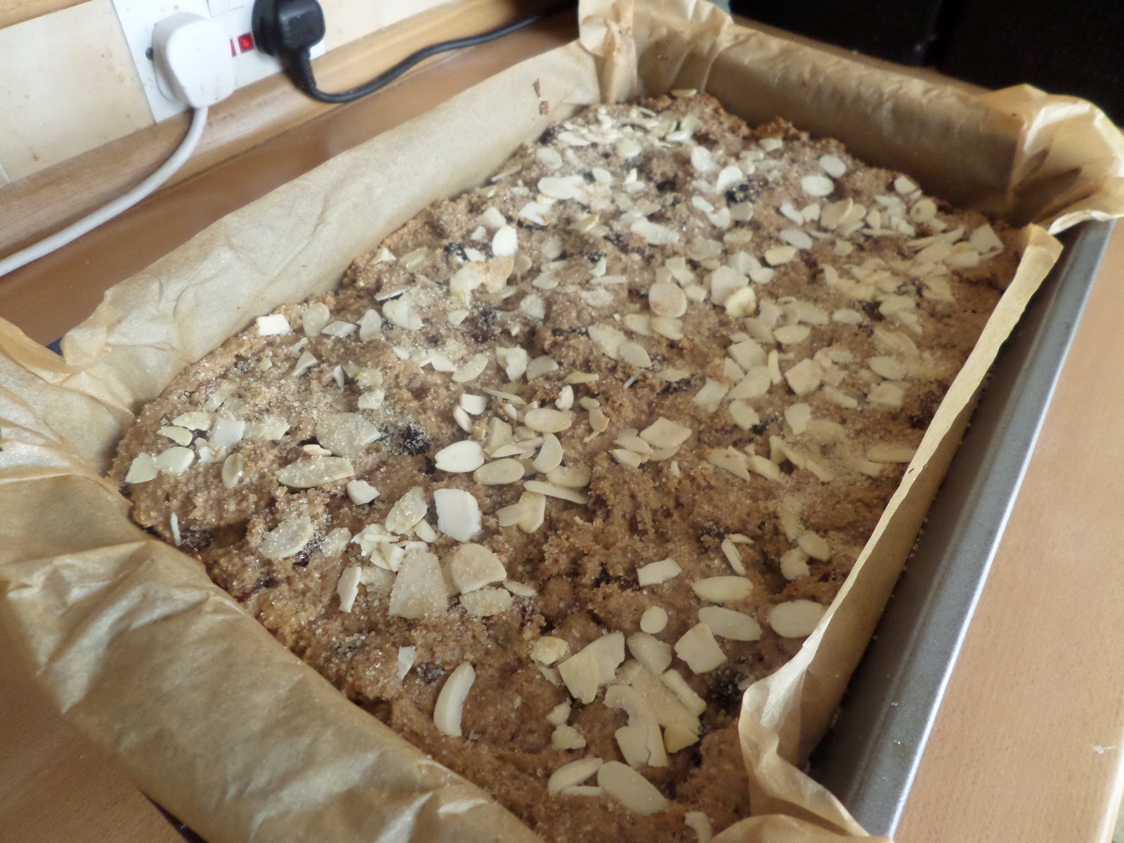 After toasting the walnuts & seeds, it’s just mixing everything up and pouring into a sling-lined baking pan. Hmm easier said than done. Using the stand mixer I might have developed some extra gluten, so spreading it out in the pan was tough work, having to stretch it rather than spread it into the edges and corners. Then I top with the flaked almonds and demerara sugar.