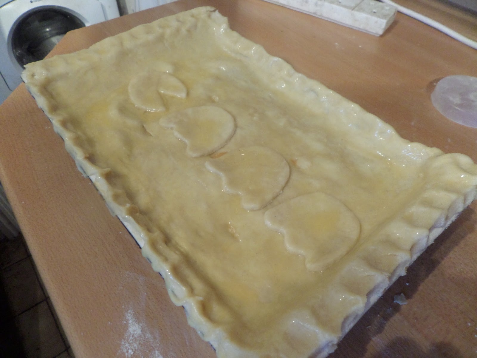 I used to object to pies that only had a top, but these days I’m excited to get to make some puff pastry, well rough puff anyway. I’ll be using the recipe from Leith’s Baking Bible p60. Compared to proper puff it’s a doddle: cut up cool but piable butter into 1cm cubes, mix with flour and water, then roll and letter-fold four times.