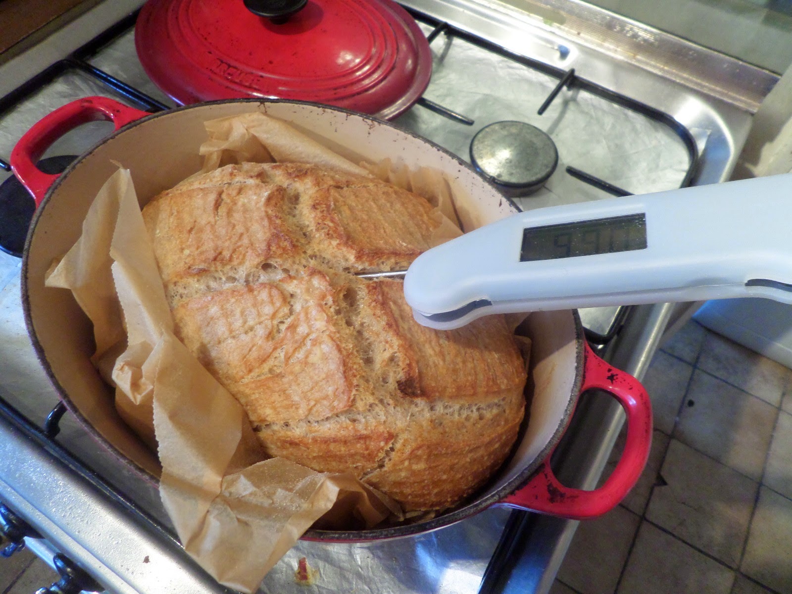 After baking for 25 mins lid on 15 mins lid off it looks pretty good, and the temp is good. But it’s developed an extra crack that I didn’t score, probably due to the parchment transfer.