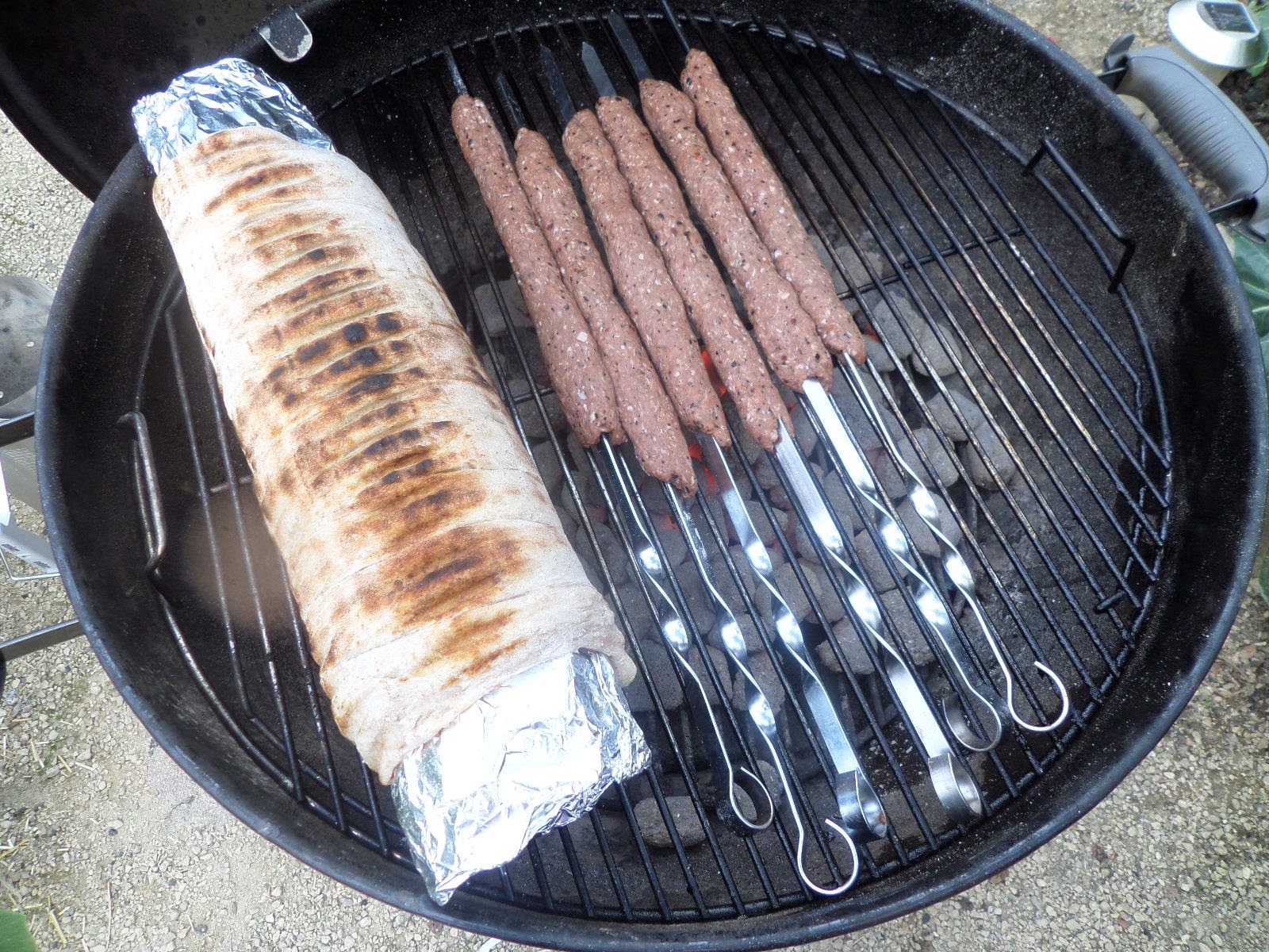 Our local kebab shop introduced me to adana kebabs, Turkish kebabs that looks like kofte kebabs but hide a much hotter spice mix. I’ve been meaning to try making them for a while but I didn’t have a recipe for them, and I only had thin rod-shaped skewers which I knew would be pointless to try using to turn kebabs on the grill as they’d just rotate while the kebab stays still.