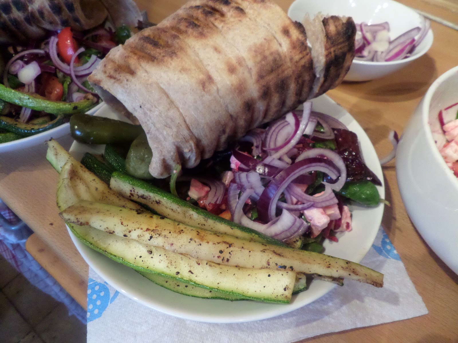 For veg I’m going to do a salad starting with a bag of beetroot & lettuce that’s in the fridge, with added tomatoes from the garden with one of Soph’s dressings, finished with some feta that needs using up. Plus for authentic kebab style: sliced red onions. And for non-authentic “our garden is making too much of this stuff” some grilled courgette slices.