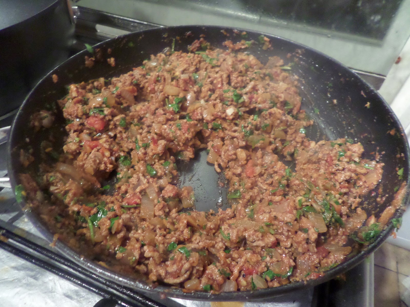 Add spices (ground cumin, cloves, cinnamon & chili flakes), chopped tomatoes, bit of red wine vinegar, simmer down to a thick sauce, then off the heat and add chopped fresh coriander.