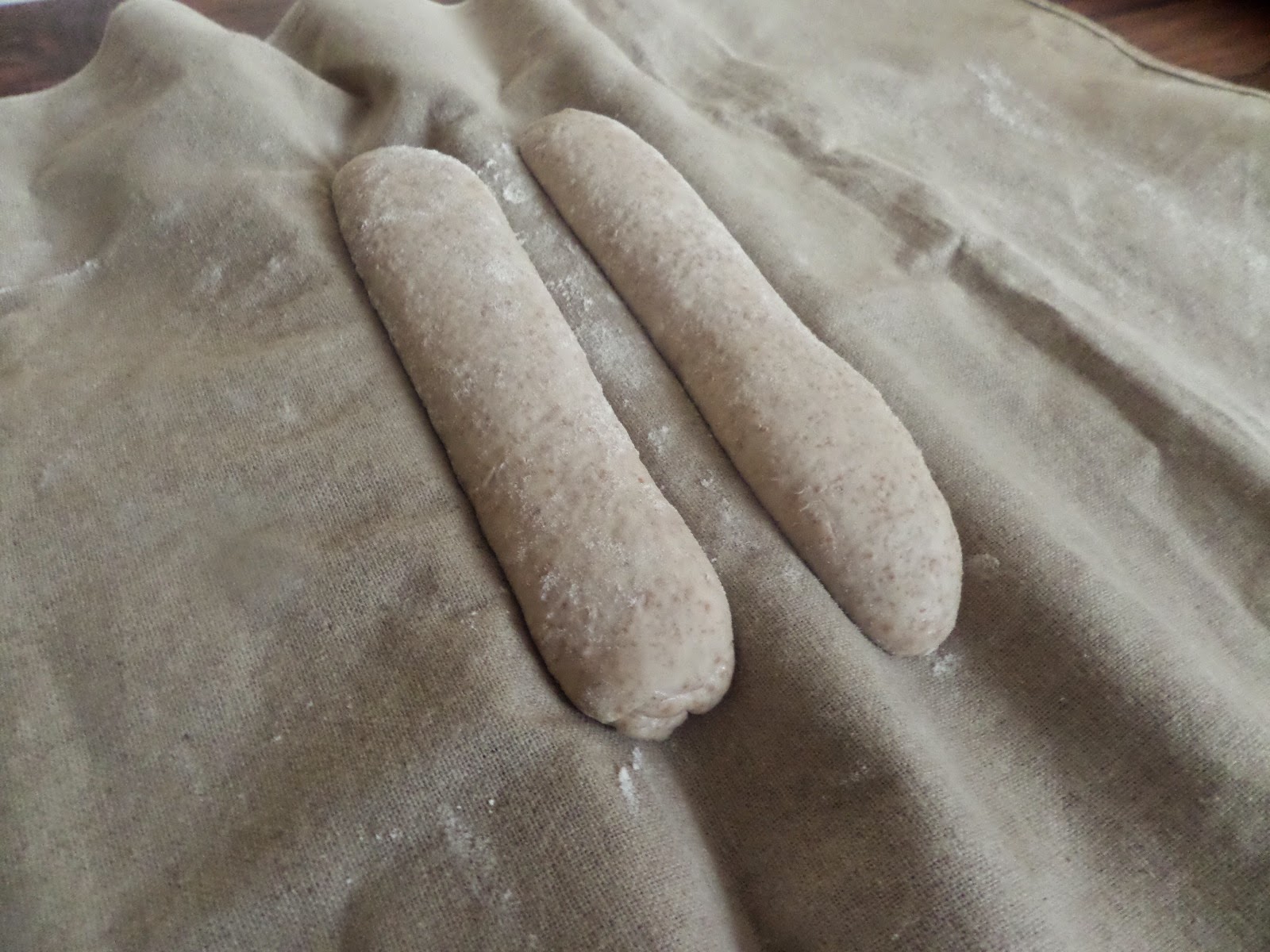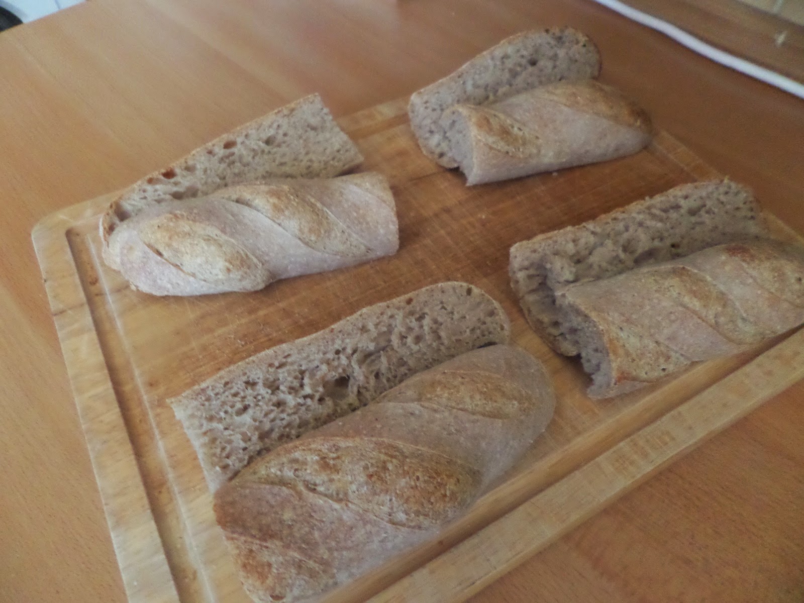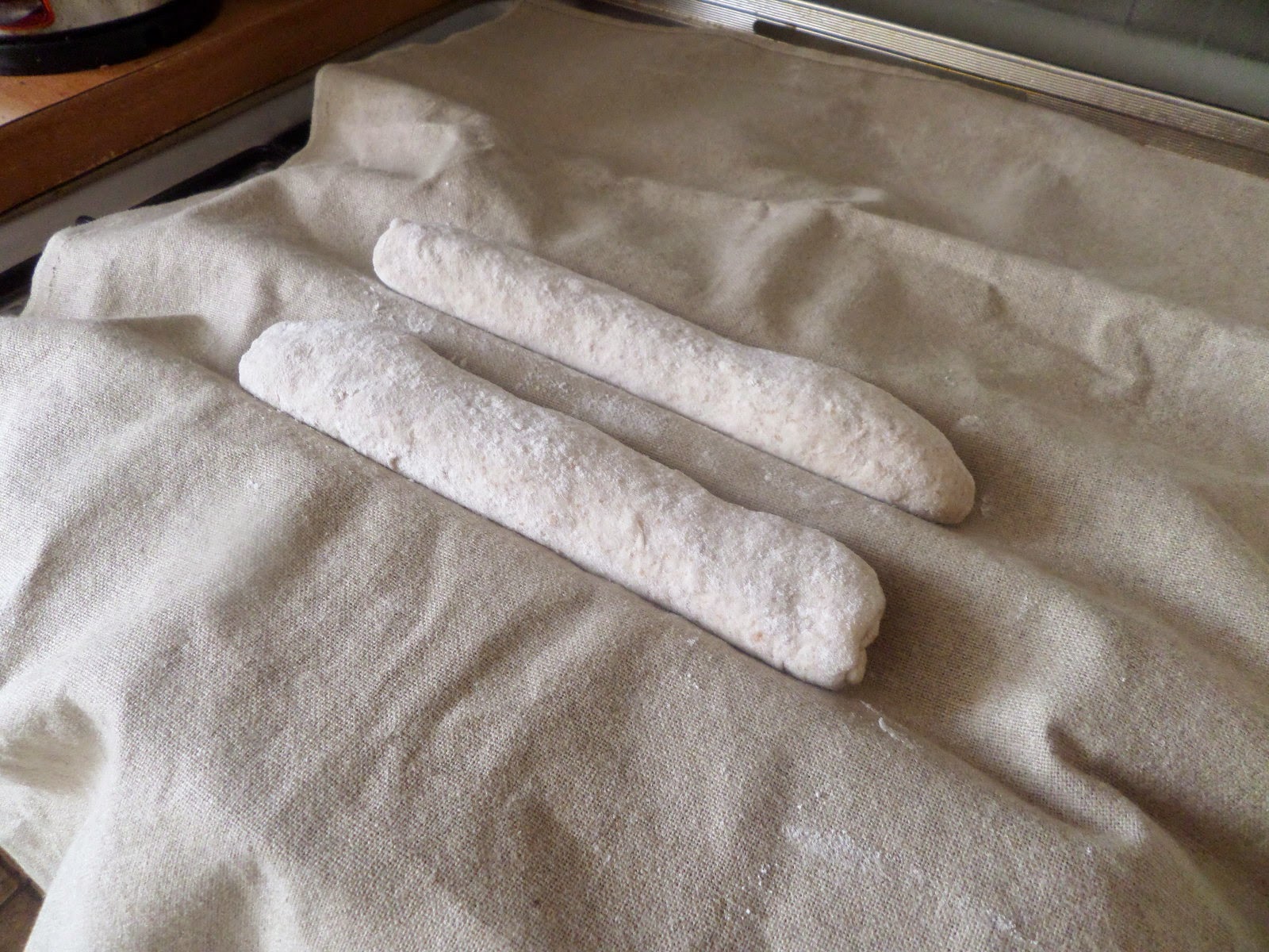An hour later I’ll slash the baguettes using my new lame. Two tips from Cook’s Illustrated here. Firstly don’t slash across or at 45 degrees, slash much more along the length of the loaf, overlapping them with each other.