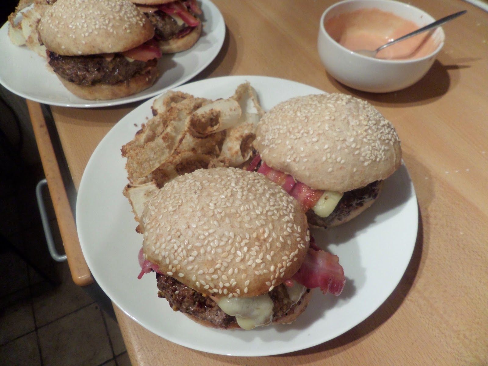 To go with the burger we’re going to do breaded onion rings. We’ll use the biggest of our garden onions, covered in sourdough breadcrumbs we’ve kept in the freezer, using flour and egg with sour cream to bind the crumbs to the onion. Then it’s into a 200C fan oven for about 15 minutes. And… the breadcrumbs did’t stick well. We need to process our breadcrumbs more before freezing them, as the large crumbs just fell off :(