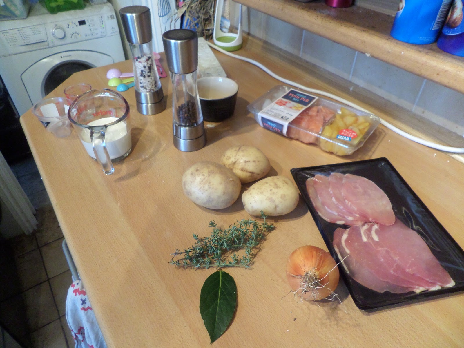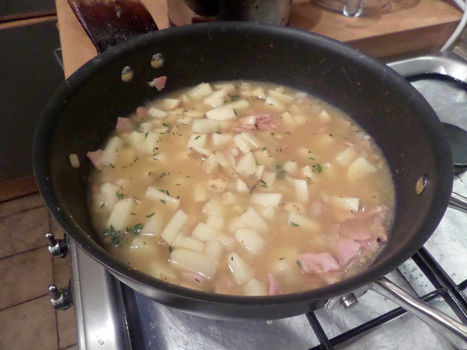Fry bacon, onions, garlic, add fish stock, potatoes, thyme & bay leaf.
