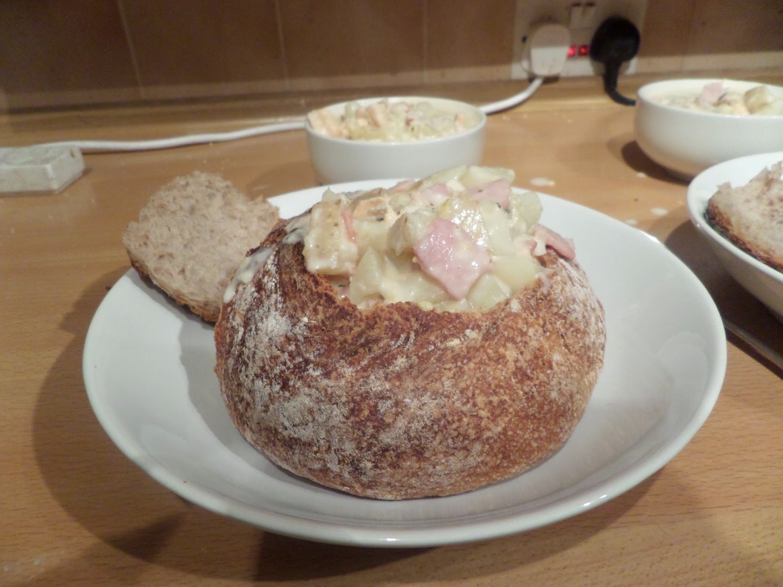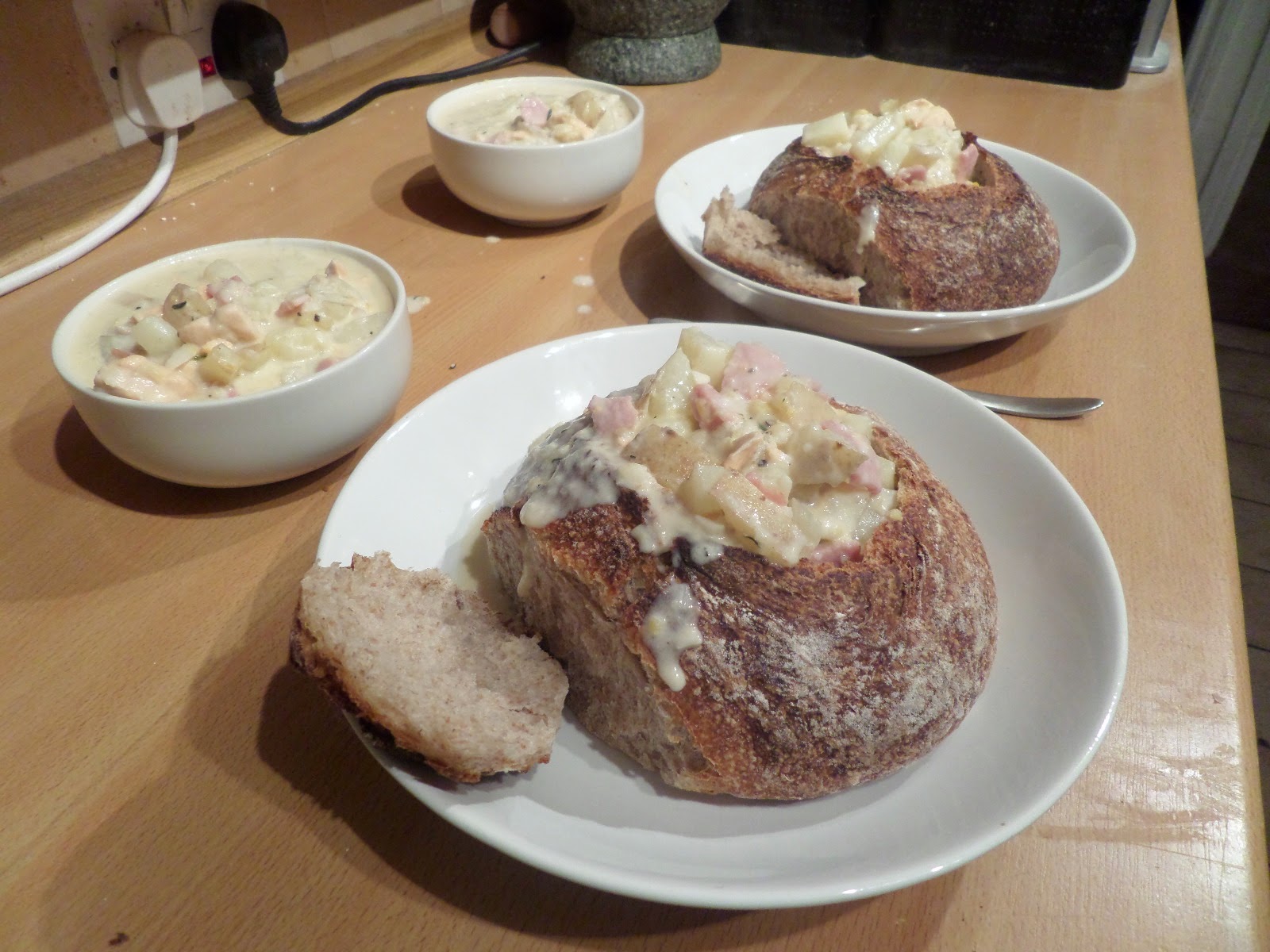 After getting help with rising my sourdough on a forum, they suggested I should make bread bowls with it, and put chowder in it. Who am I to argue?
