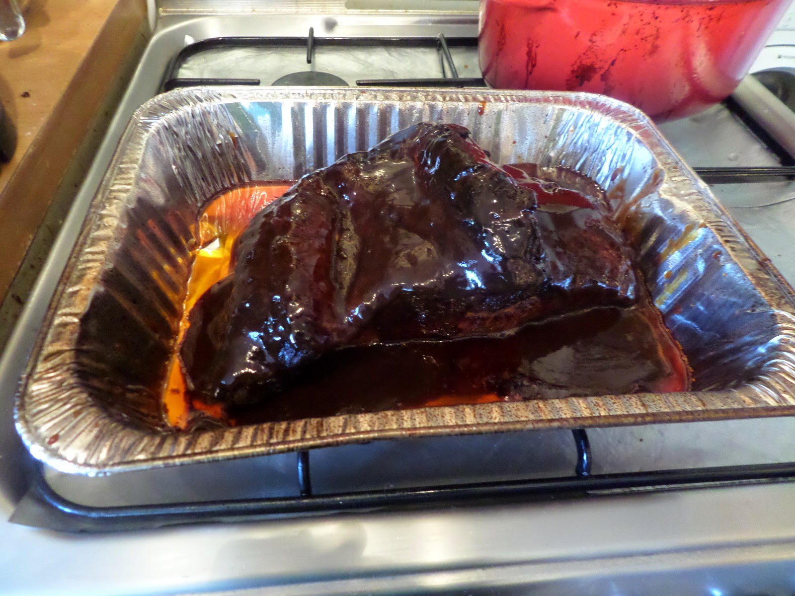Then it gets coated in a quick barbecue sauce and transferred to the oven for two hours at 130C fan, until it reaches 90C internally and then it stands for half an hour before carving.