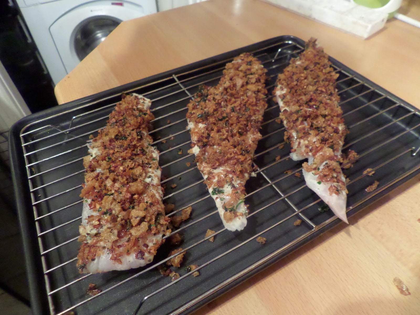 This had sourdough breadcrumbs added to it and fried until the breadcrumbs started turning colour and crisping up. After cooling it was stuck to the fish with mayo.