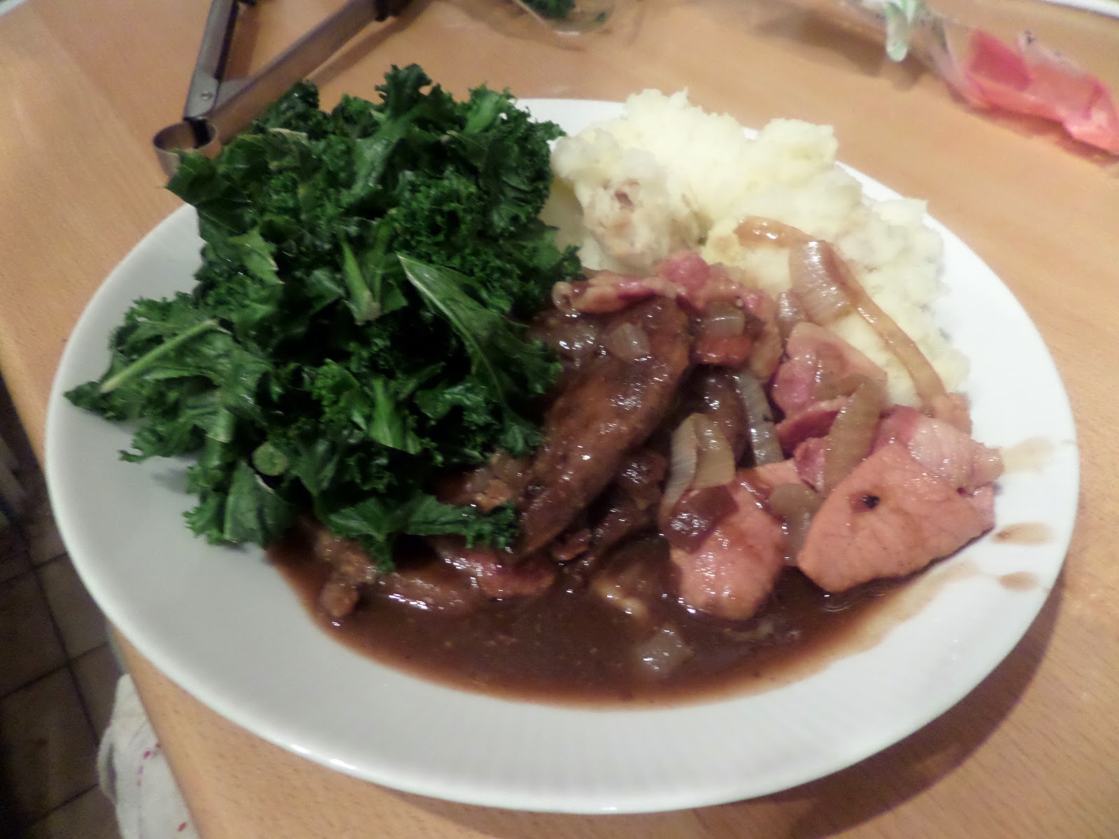 So as the weather turns colder it’s time for a nice warming plate of liver and bacon, with mash potatoes, greens and onion gravy, based on this Hairy Bikers recipe.