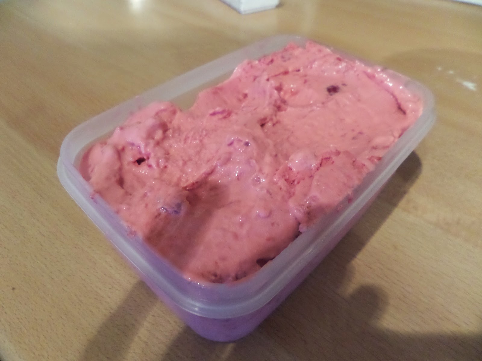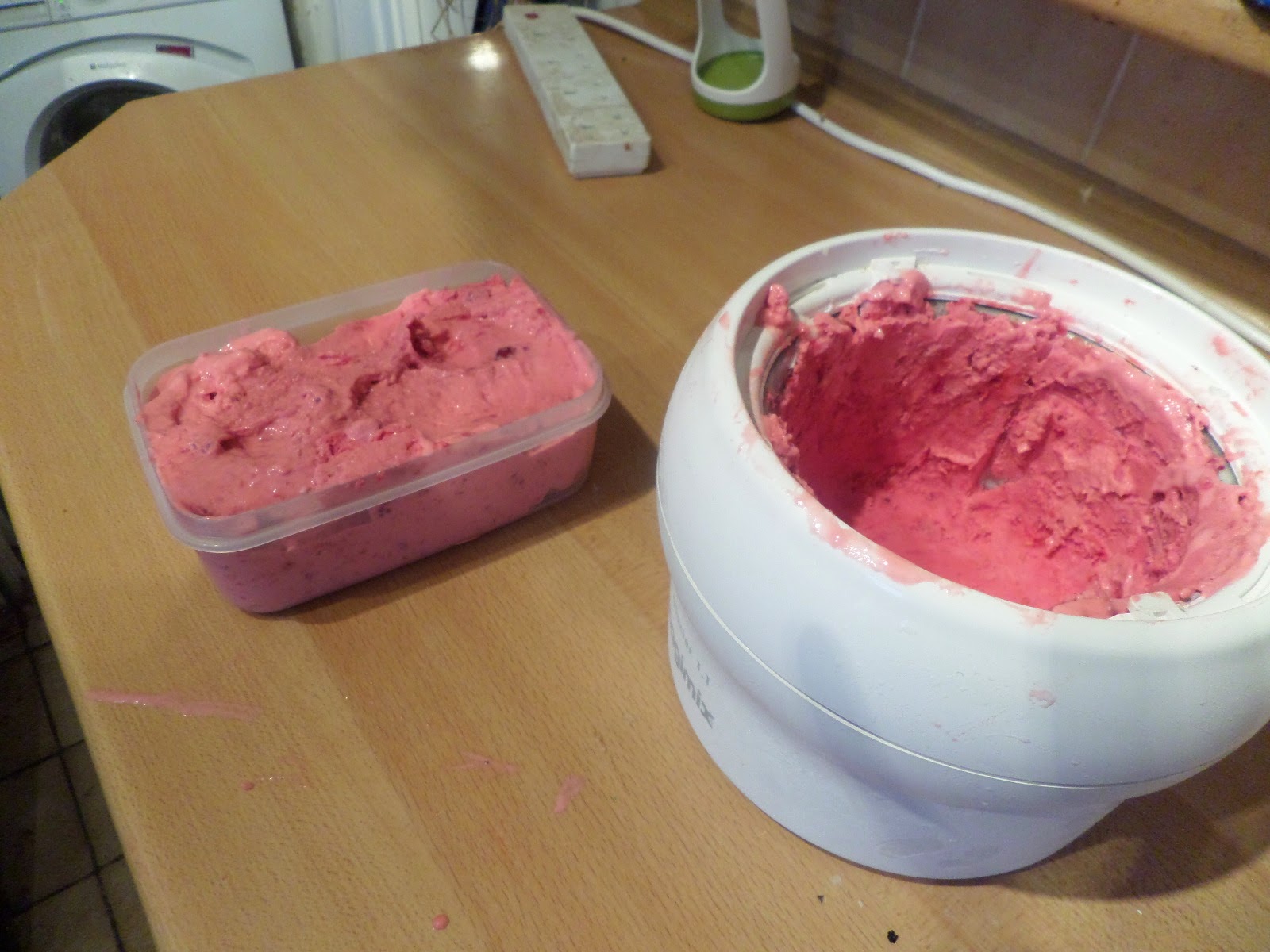 It’s just a matter of putting 0% fat Greek yogurt and raspberries in the ice cream maker, turning it on, then popping it in the freezer for future use.