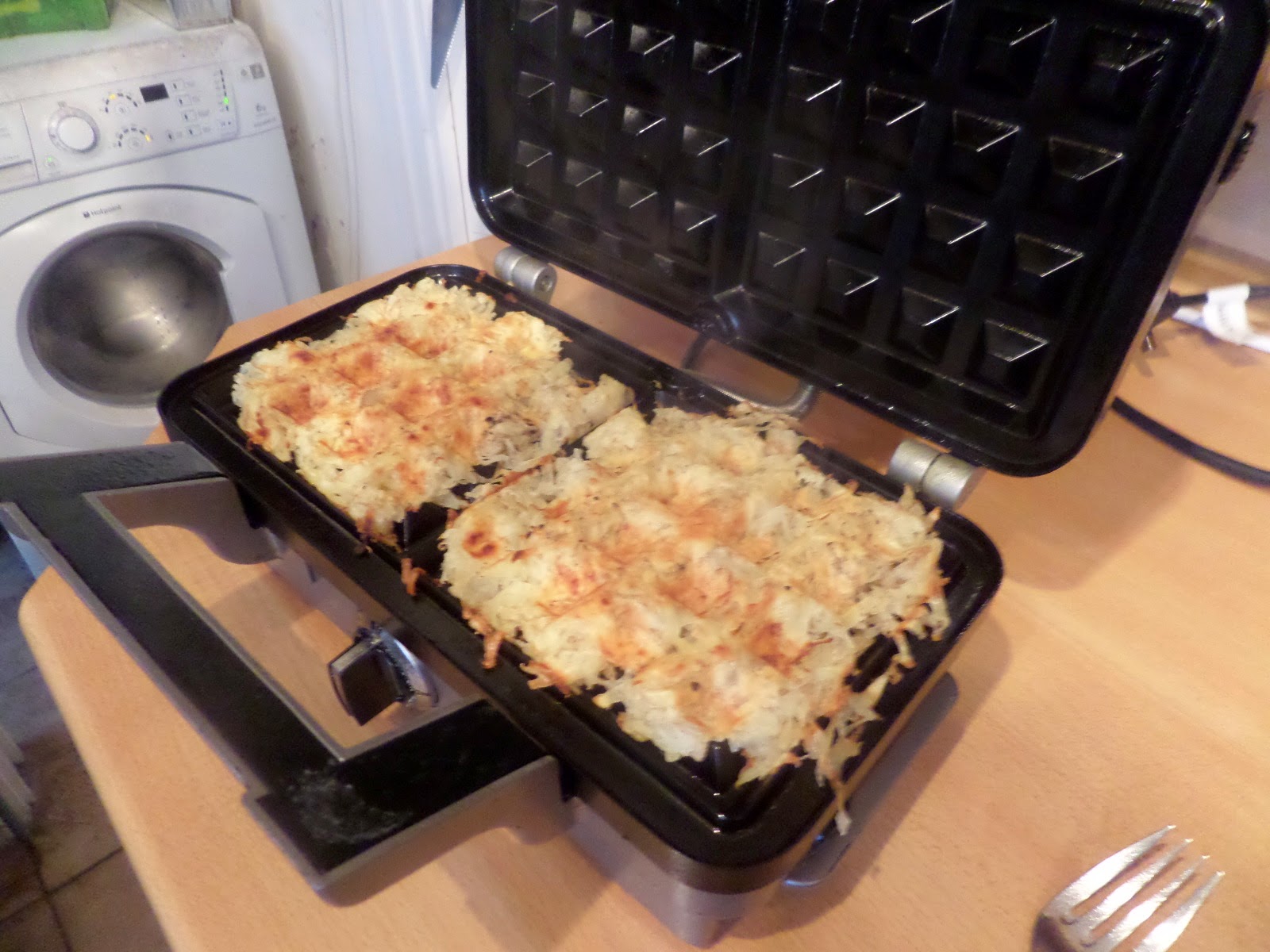You grate a couple of baking potatoes, squeeze out the water in a muslin, season, then waffle them up for about 7 minutes.