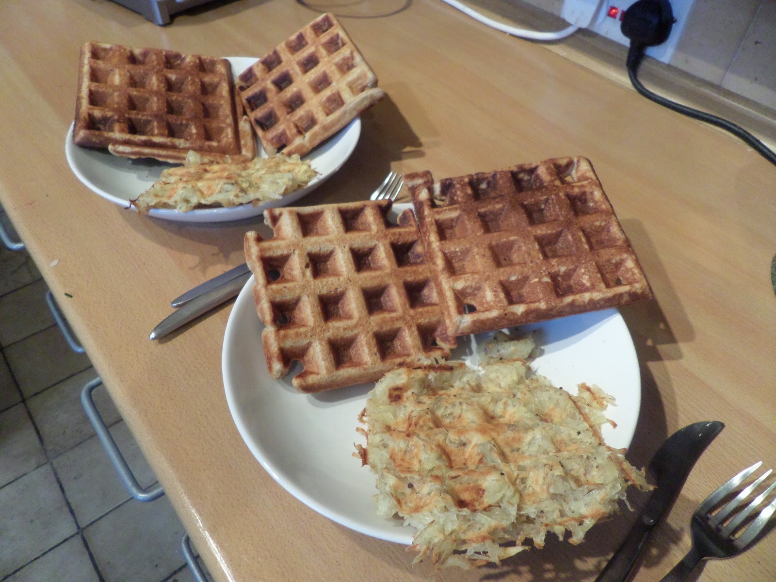 According to Serious Eats you can make hash browns (potato rostis) in a waffle iron. So to go with our waffle brunch today we’re trying that.