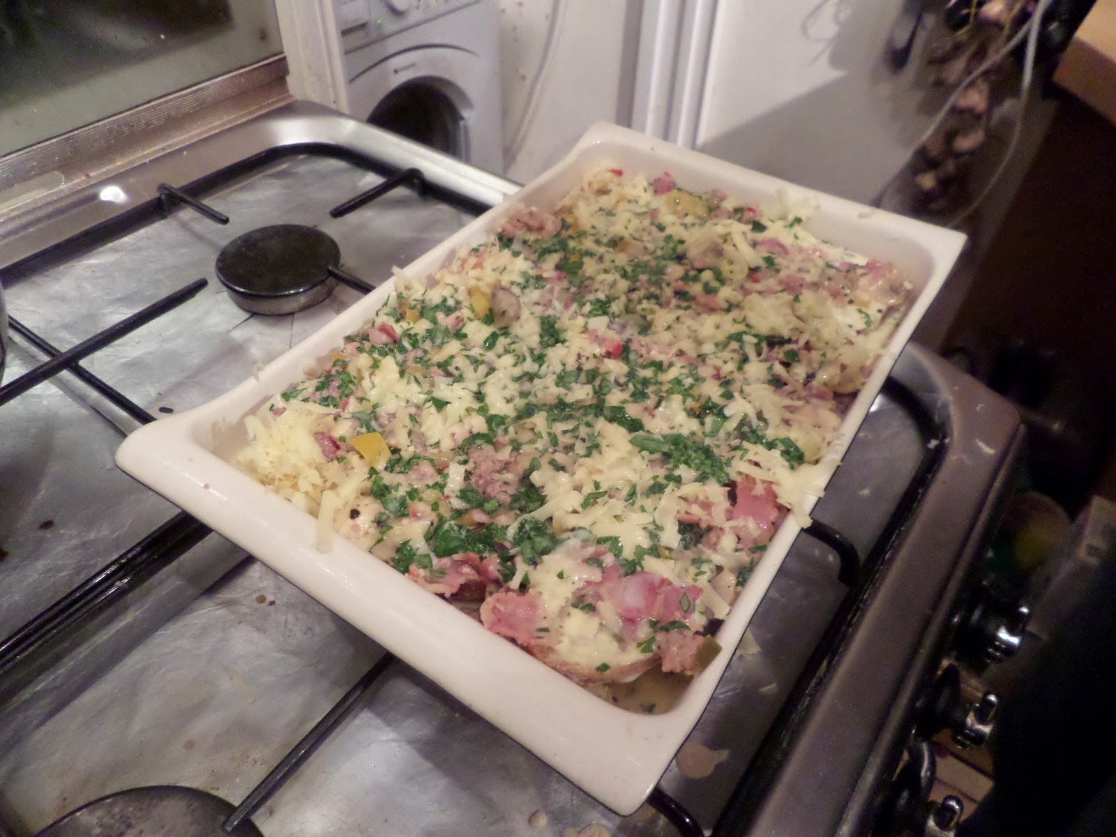 Then we fry up sausage meat, bacon, various breakfast veg… then layer it up.