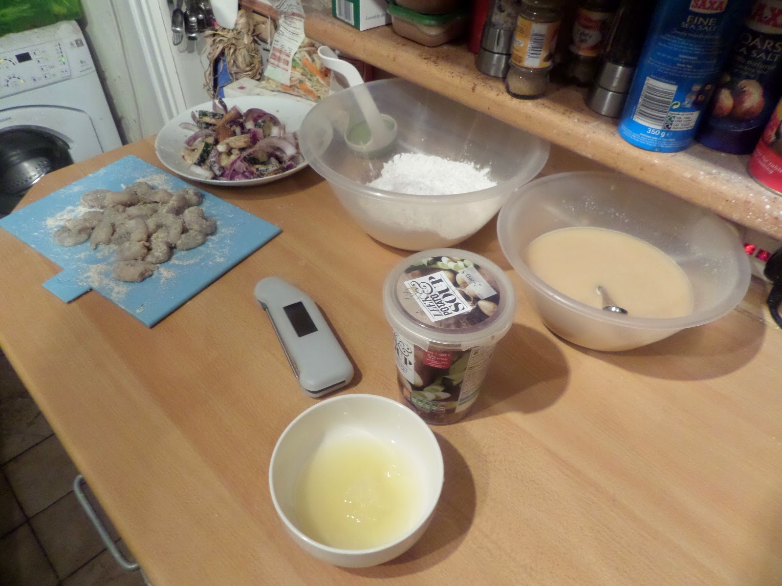 However it uses shell-on small/medium shrimp to get the crispiness, and the prawns we have in the freezer are shelled. So what I’m going to do it use rye tempura batter to get them nice and crispy. This time we’re varying it slightly to avoid wasting vodka: