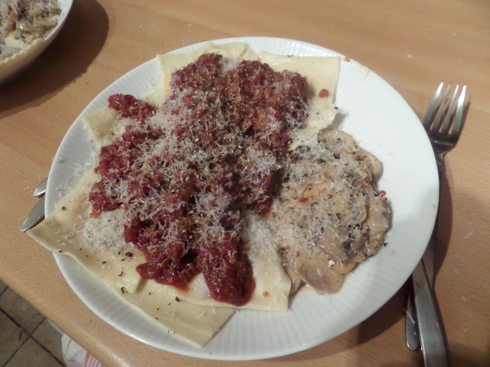 However it was pretty simple: put leftover bolly inside pasta sheets, and serve in a marinara sauce. So I’m defrosting Soph’s chilli bolly, putting it inside pasta sheets I’ll make, and then get Soph to make her spicy marinara sauce & Sunday mushrooms (cream is involved :) to serve with it.