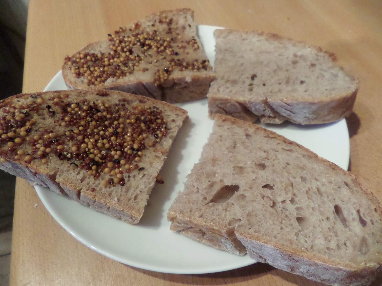 I’m trying the mustard without processing it, so it’s extra grainy. The brea looks good, with a nice open crumb and crispy crust.