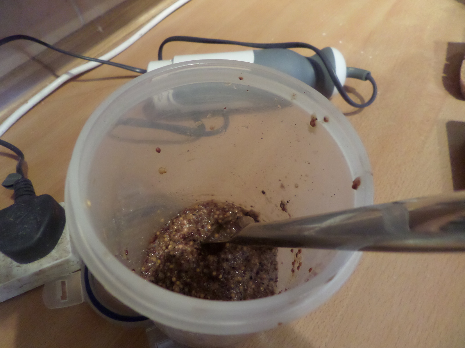 Update: Soph gave the mustard a quick go with the handheld stick blender, and it made the mustard a lot better. It still have big crunchy seeds, but now there’s a thickness to the sauce that was lacking when I had it unprocessed.
