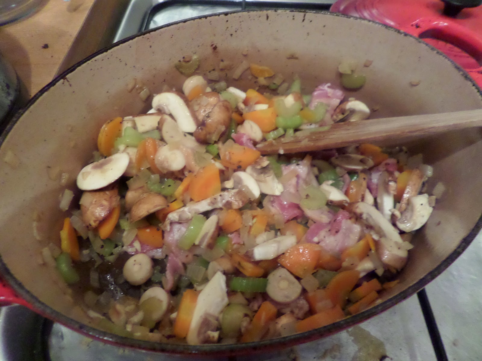 Then add in bacon and garlic. Oh and some mushrooms I found in the fridge. It’s become chicken and mushroom pie!