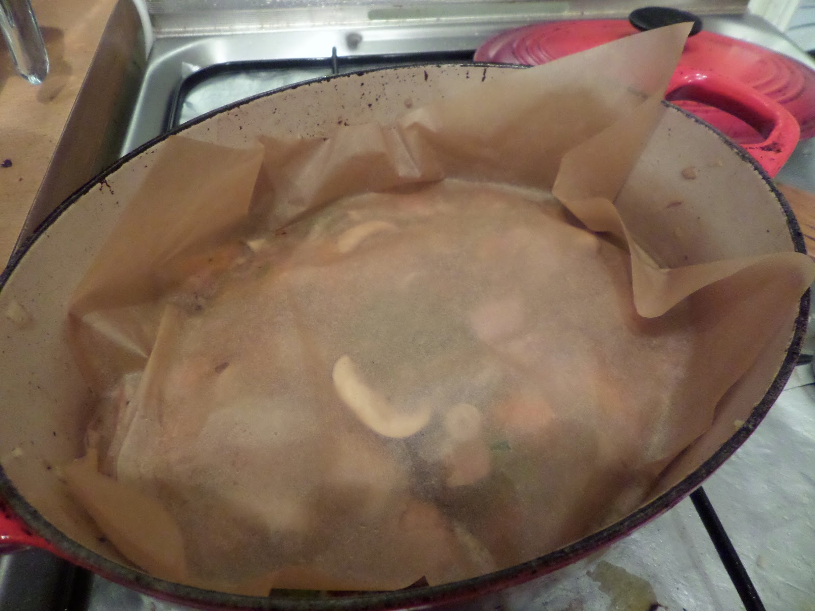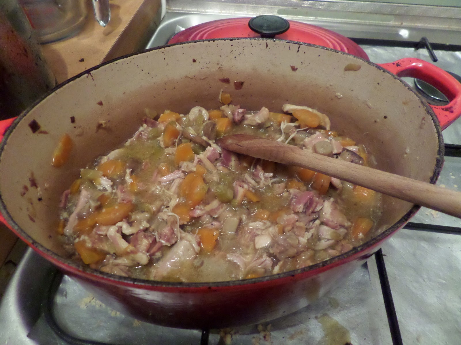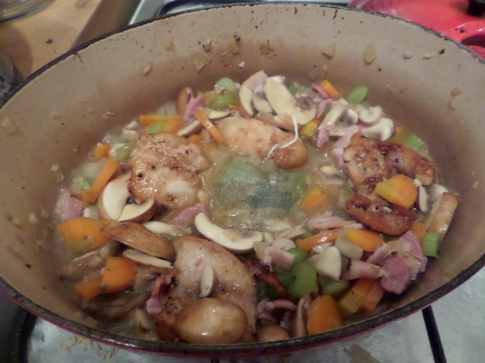Then add the rabbit chicken and wine back in, add bouquet garni (thyme, sage, bay leaf) top up to braising level with chicken stock, bring to simmer.